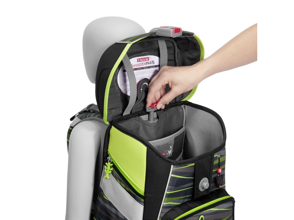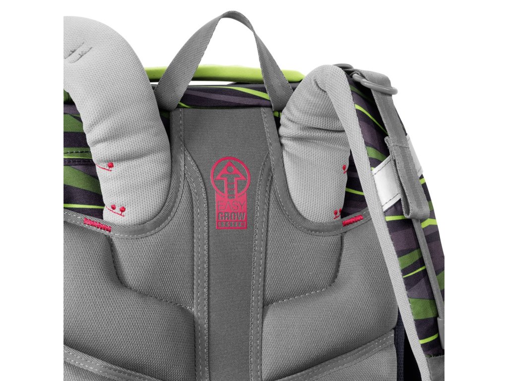 - možnost plynulého výškového nastavení ramenních popruhů pomocí otočného mechanismu uvnitř aktovky, zajišťuje přesné nastavení ramenních popruhů přímo na zádech dítěte