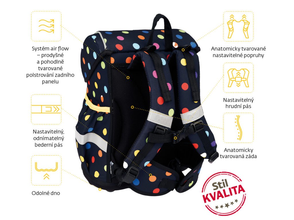 - POHODLÍ – výškově nastavitelný hrudní a nově i odnímatelný bederní pás s kvalitní přezkou zajistí pohodlné usazení aktovky na zádech dítěte i správné rozložení váhy