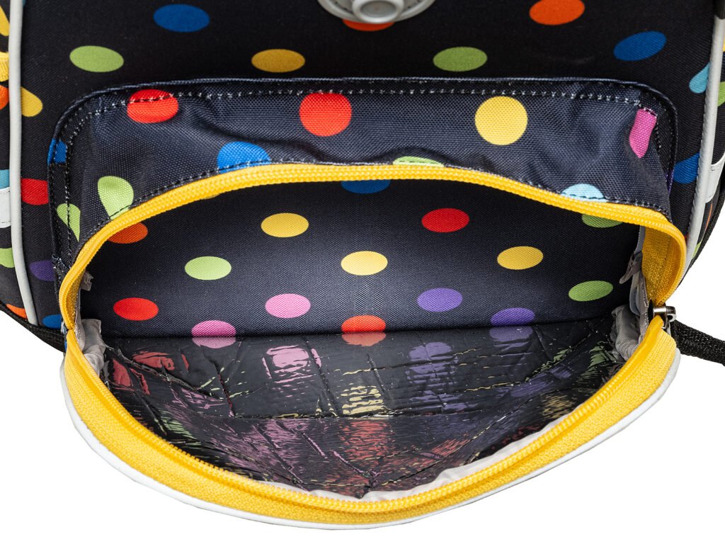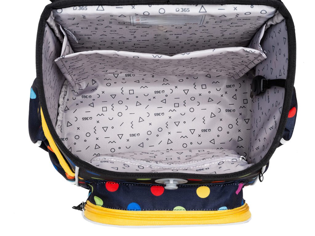 - VNITŘNÍ USPOŘÁDÁNÍ – prostorná hlavní vnitřní komora je rozdělená látkovou přepážkou pro uložení boxu na sešity či knih. Součástí hlavní komory je také kapsička pro uložení drobností, odepínatelný kroužek na klíč a štítek na jméno a adresu. Ve víku je průhledná kapsička na rozvrh hodin