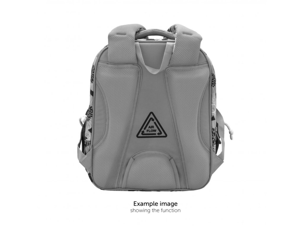 Zádová část je měkce polstrovaná a prodyšná, ramenní popruhy jsou nastavitelné a doplněné hrudním i odnímatelným bederním pásem. Tím se váha rozloží rovnoměrně a nošení zůstává pohodlné po celý den.