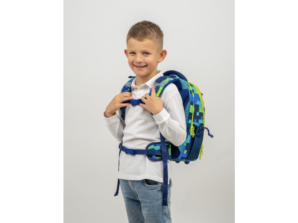 Aktovka má pevné dno s pěti nožičkami, které zajišťují stabilitu a chrání před špínou i vlhkostí. Materiál je voděodolný polyester, který zvládne i deštivé školní dny.