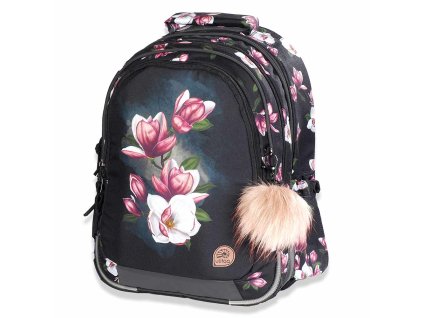 Školní batoh české výroby s krásnou magnolií pro dívky od 3. do 5. třídy ZŠ. Taška sedí na zádech většiny dětí s výškou 134 až 152 cm.