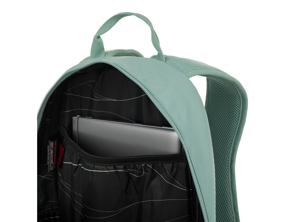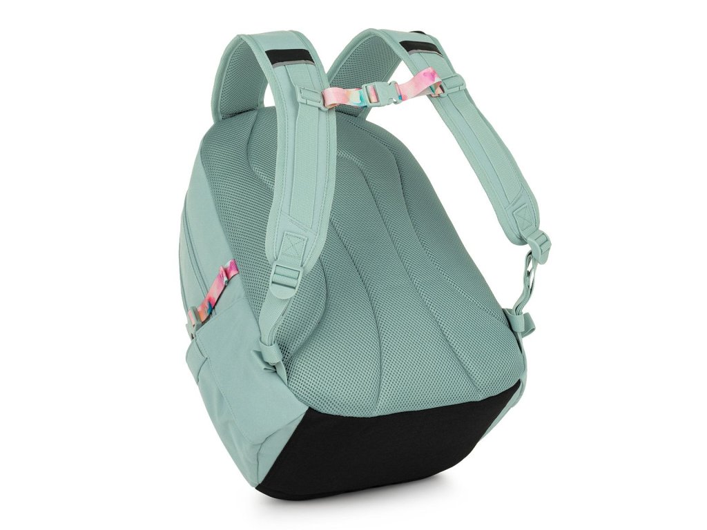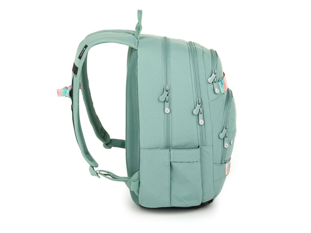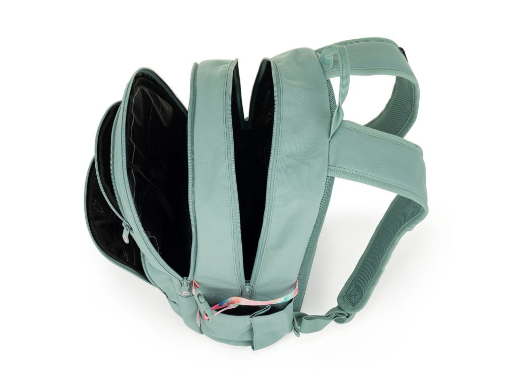 Mintový dvoukomorový batoh se stylovou nášivkou a barevně potištěnými popruhy – novinka, která nás osobně hodně baví! Záda batohu jsou polstrovaná a anatomicky tvarovaná z měkké pěny. Uvnitř zadní komory je umístěna polstrovaná kapsa na notebook a síťovaná kapsa na zip, v druhé komoře najdete klíčenku.