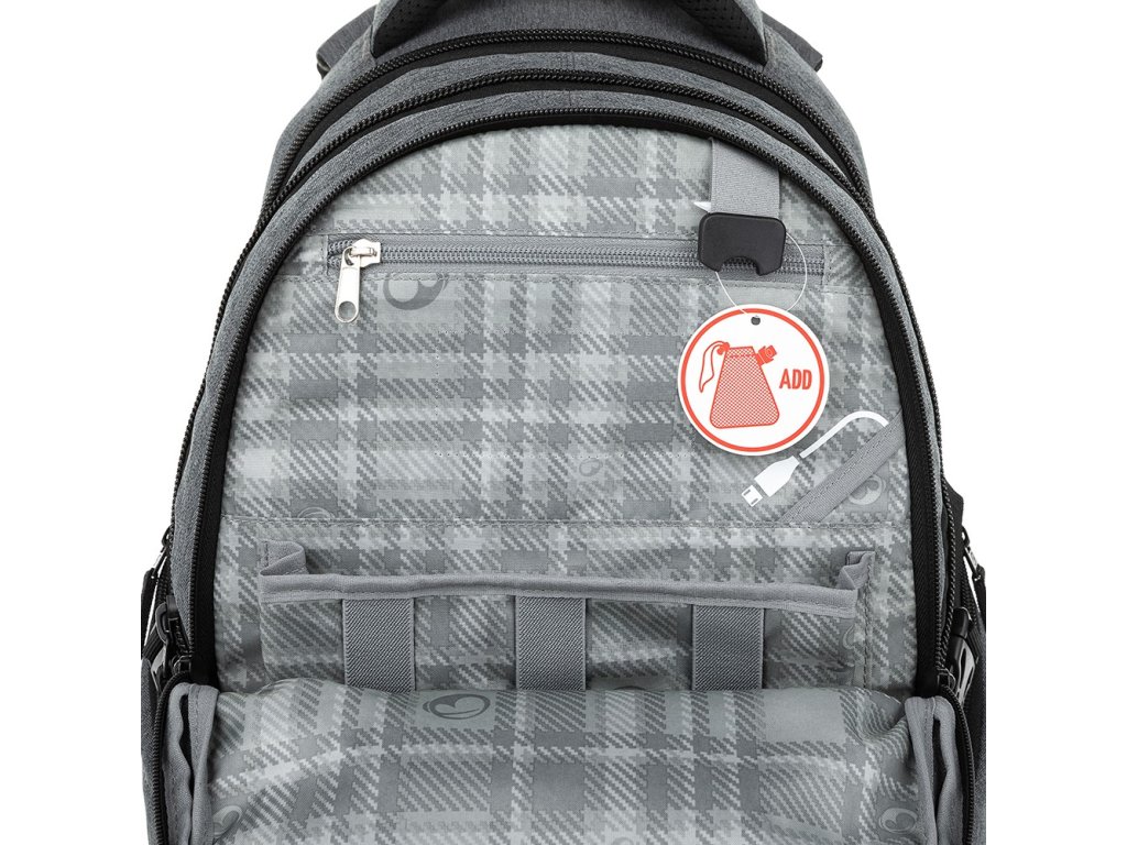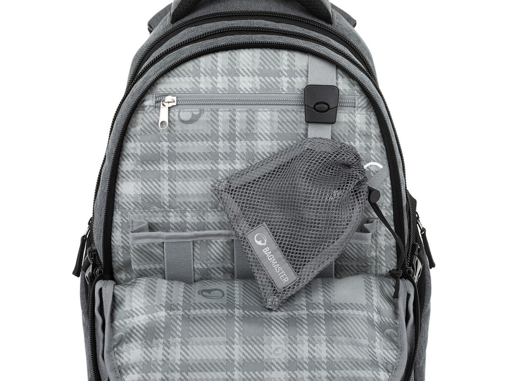 Detailní popis BAG: Hlavní komora je velmi prostorná, pohodlně se do ní vejdou např. školní desky i učebnice formátu A4. Uvnitř komory velká kapsa na gumu a polstrovaná kapsička na MP3 přehrávač nebo power banku (rozměry kapsičky: 8,5 x 10 x 2cm), z hlavní komory je vývod na kabel nebo sluchátka.