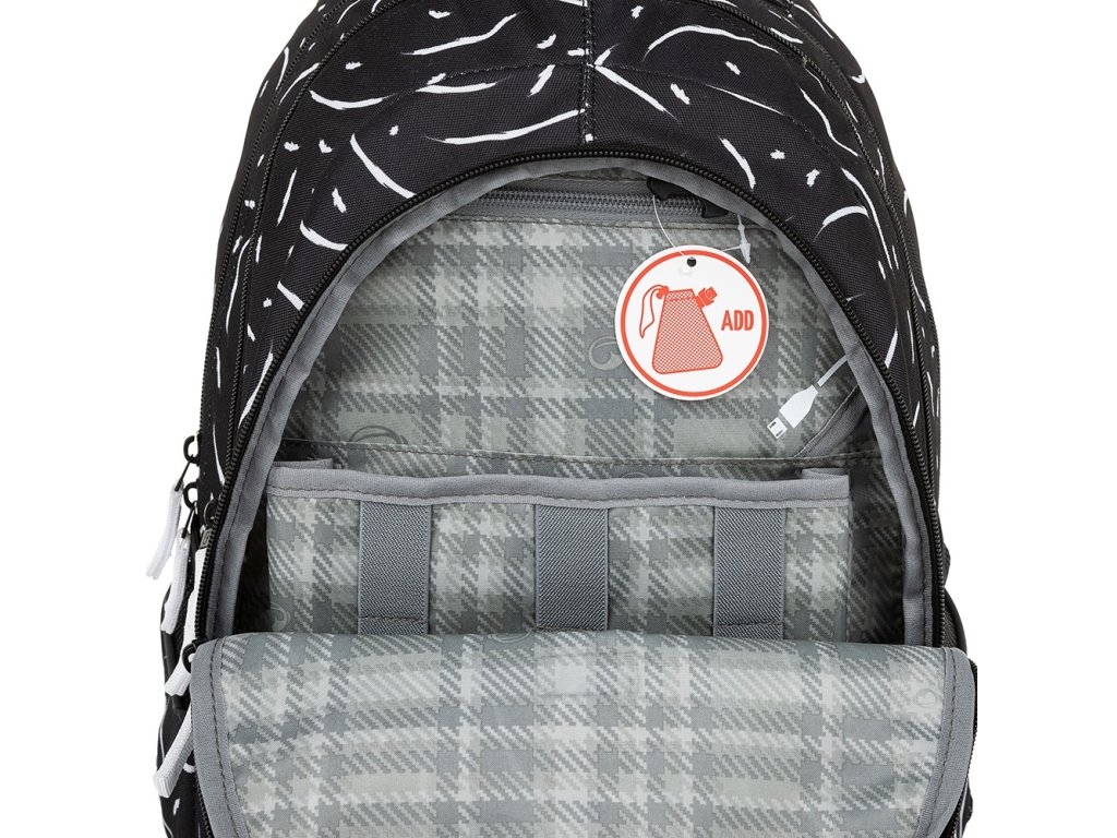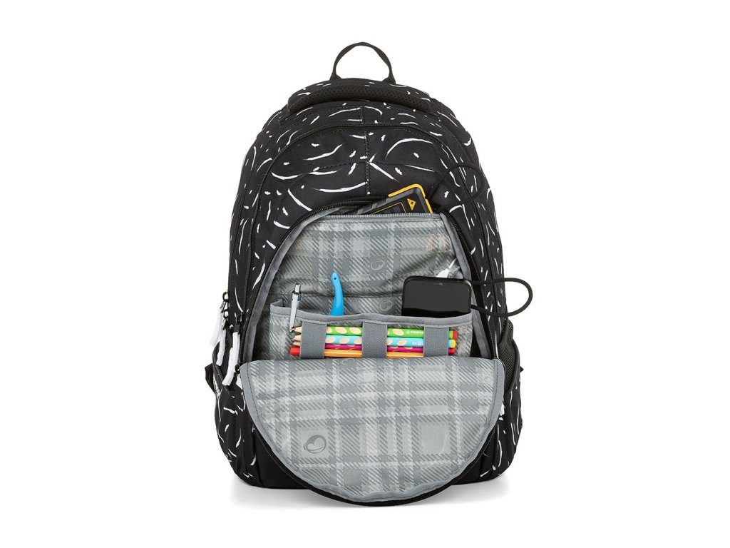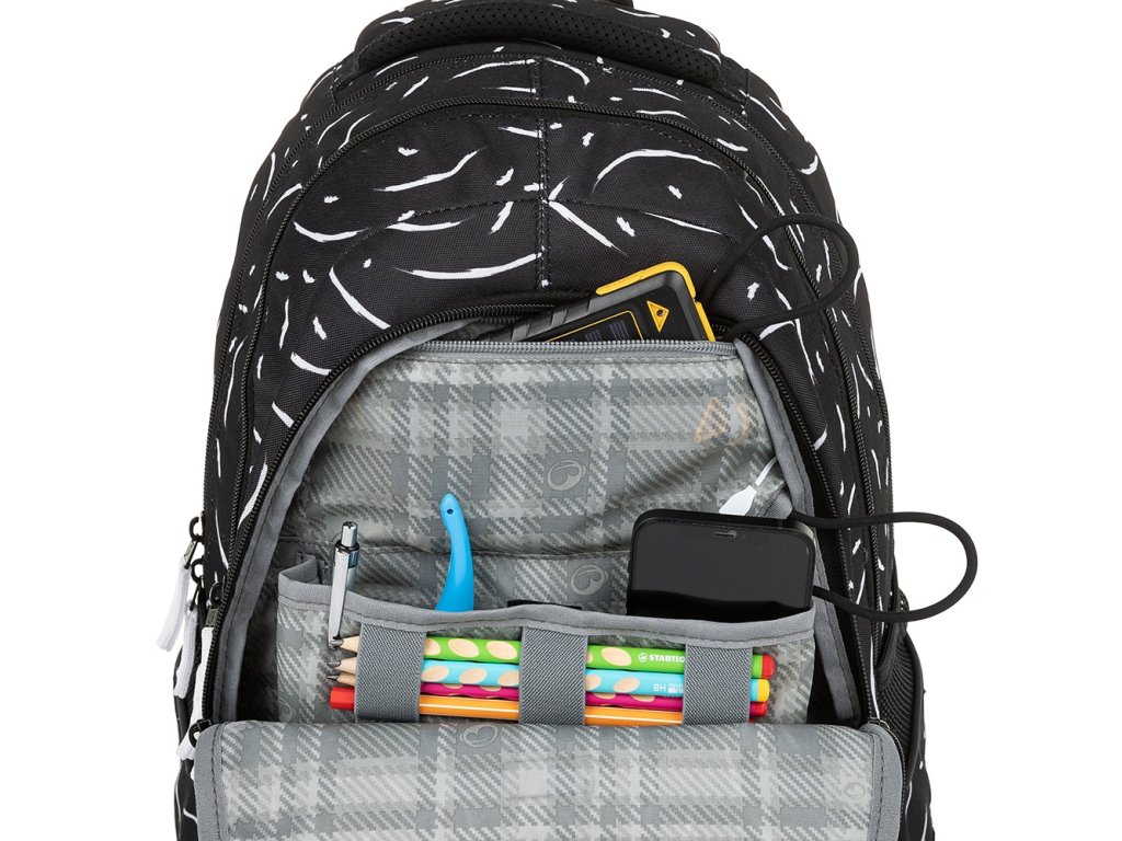 - Na černou přezku v přední kapse můžete školačce připnout síťovaný sáček Třeba na peníze nebo sluchátka. Do kapsičky na zip se vejde power banka. Nabíjecí kabel stačí otevřeným rožkem protáhnout k telefonu umístěnému v organizéru.