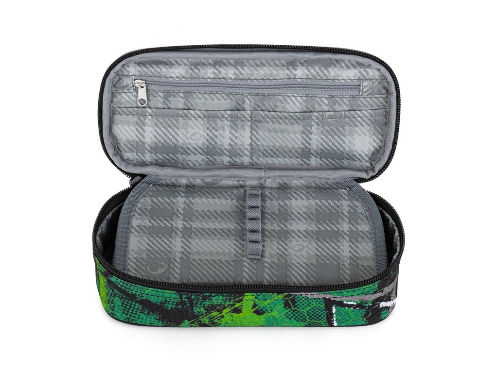 - Zároveň zde bude mít každá pomůcka své místo – psací potřeby patří do 20 gumových úchytů, kružítka, gumy, pravítko a zvýrazňovače mají místo pod přepážkou s úchytky a ze spodu víka jsou přihrádka a kapsičky na doklady, karty nebo fleshky.