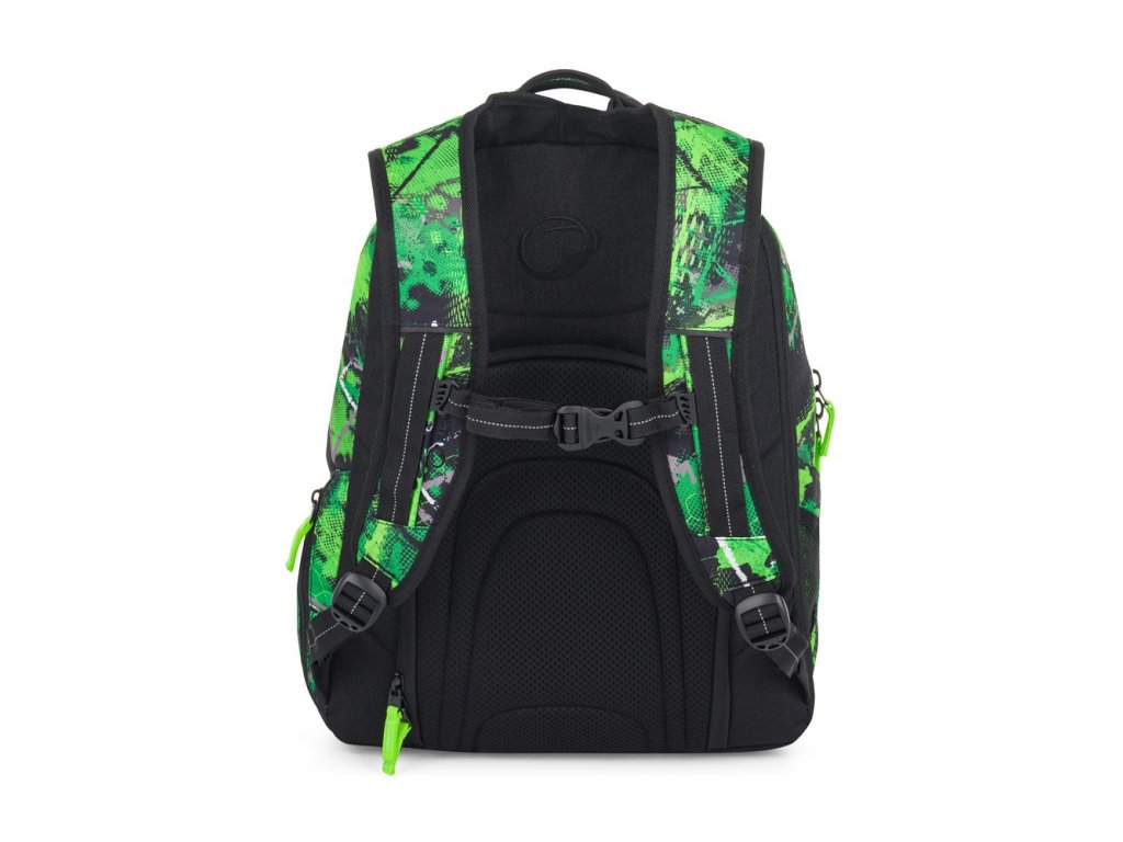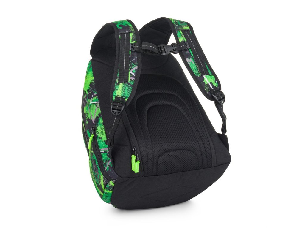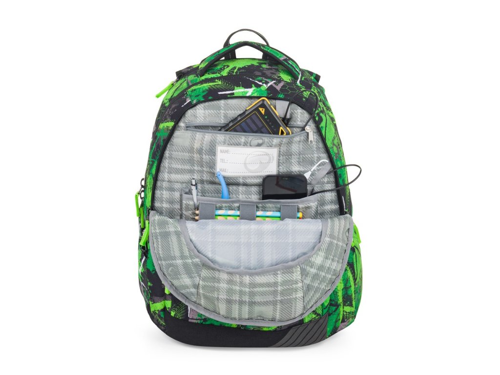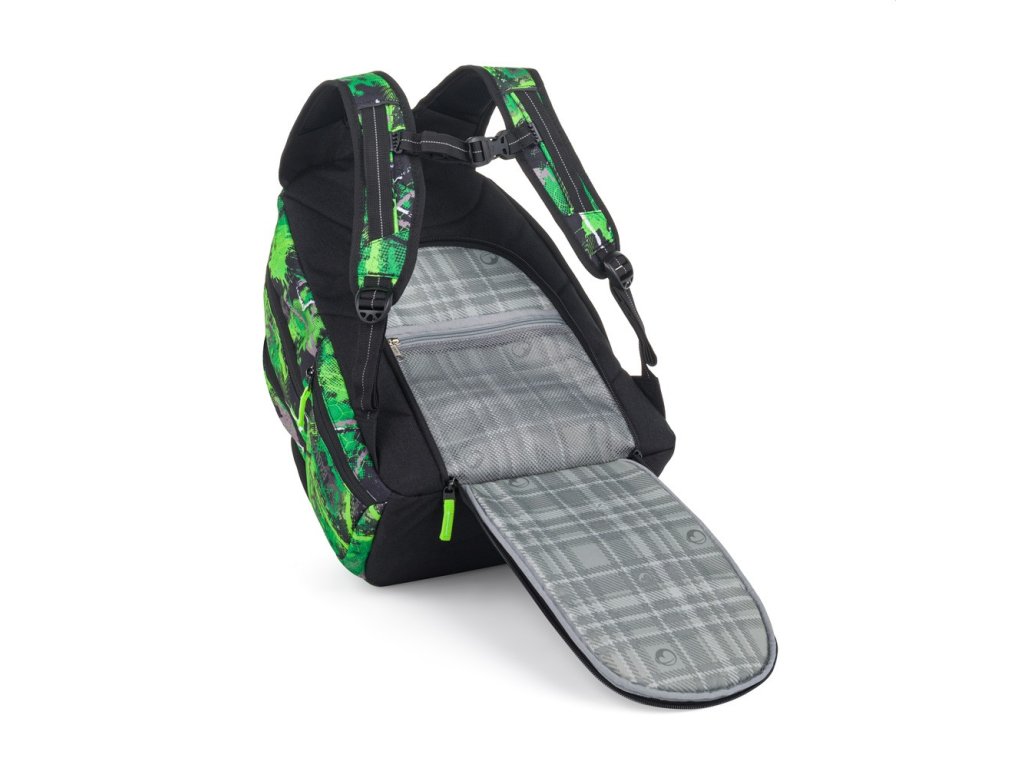 - Zadní komora batohu má sklopné dno, díky kterému se spodní část zpevní a lépe se do něj vkládají učebnice a sešity. Navíc se jim díky tomu nemačkají rožky.