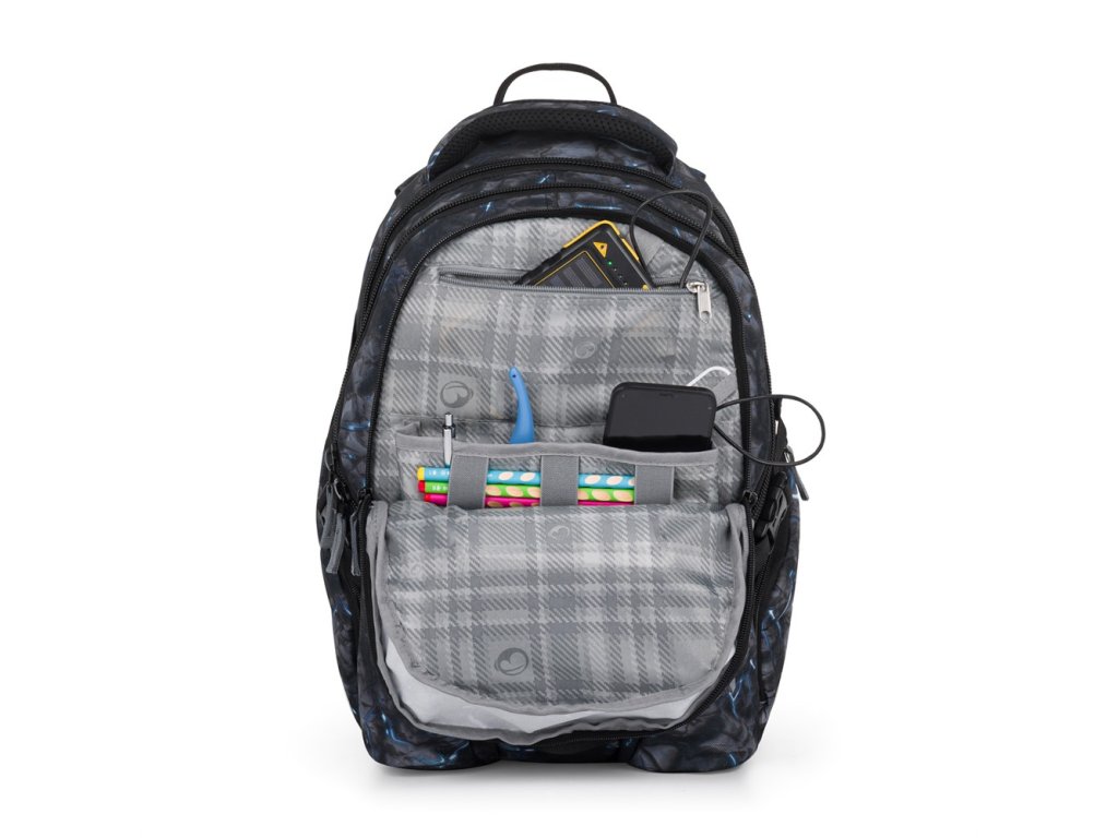 - Do hlavní komory se vejdou velké desky, sešity formátu A4 a v polstrované kapse je místo na tablet nebo notebook s úhlopříčkou až 15”. V horní části je popruh na suchý zip, kterým školák uvnitř laptop pevně přichytí.