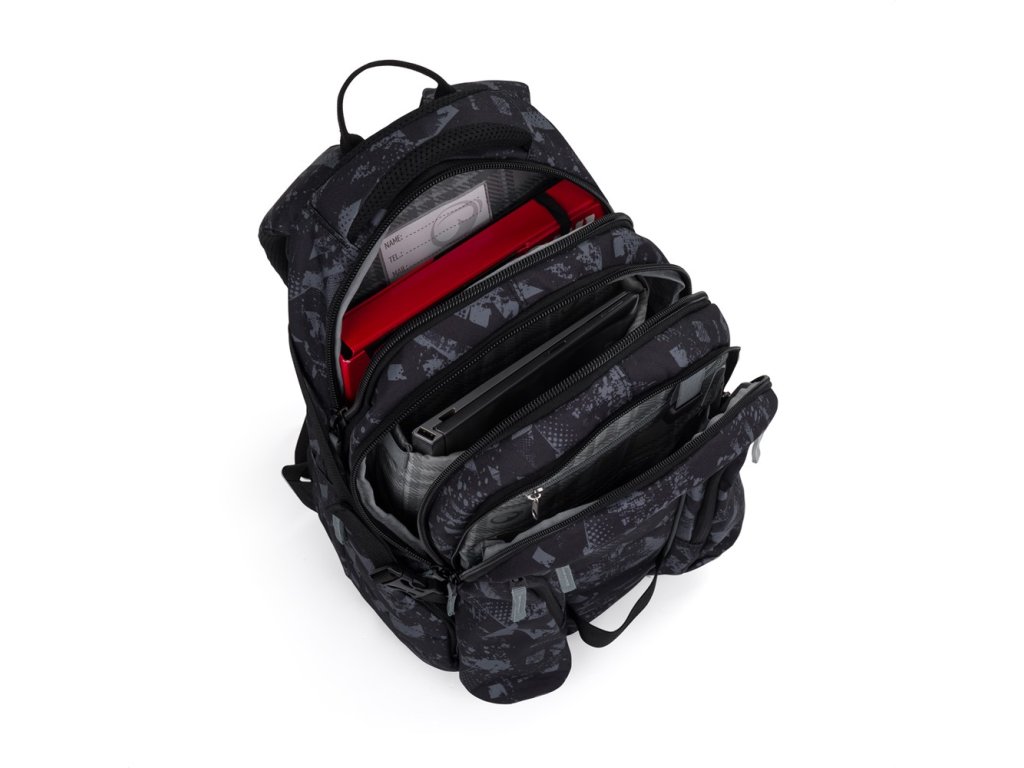 - Do hlavní komory se vejdou velké desky, sešity formátu A4 a v polstrované kapse je místo na tablet nebo notebook s úhlopříčkou až 15”. V horní části je popruh na suchý zip, kterým školák uvnitř laptop pevně přichytí.