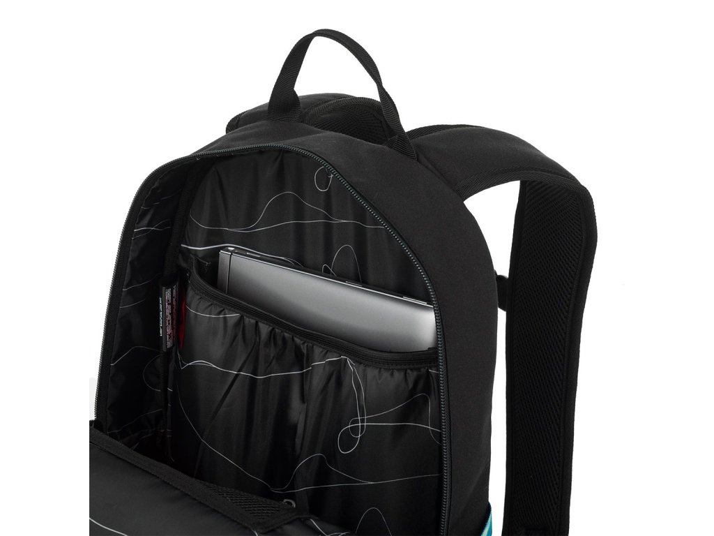 Dvoukomorový batoh se stylovou nášivkou v oblíbené tmavé barvě s barevně potištěnými popruhy – novinka, která nás osobně hodně baví! Záda batohu jsou polstrovaná a anatomicky tvarovaná z měkké pěny. Uvnitř zadní komory je umístěna polstrovaná kapsa na notebook a síťovaná kapsa na zip, v druhé komoře najdete klíčenku.