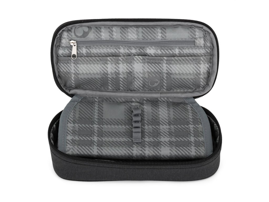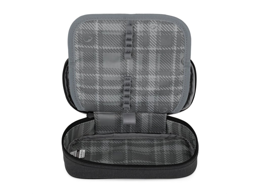 - Zároveň zde bude mít každá pomůcka své místo – psací potřeby patří do 20 gumových úchytů, kružítka, gumy, pravítko a zvýrazňovače mají místo pod přepážkou s úchytky a ze spodu víka jsou přihrádka a kapsičky na doklady, karty nebo fleshky.