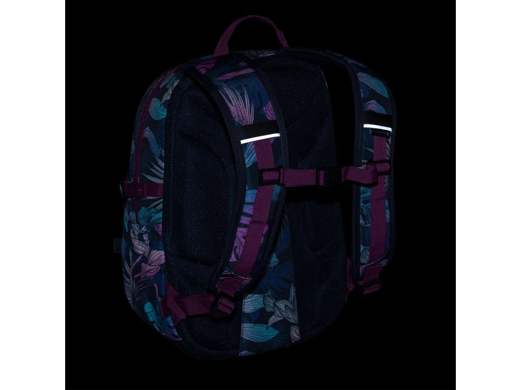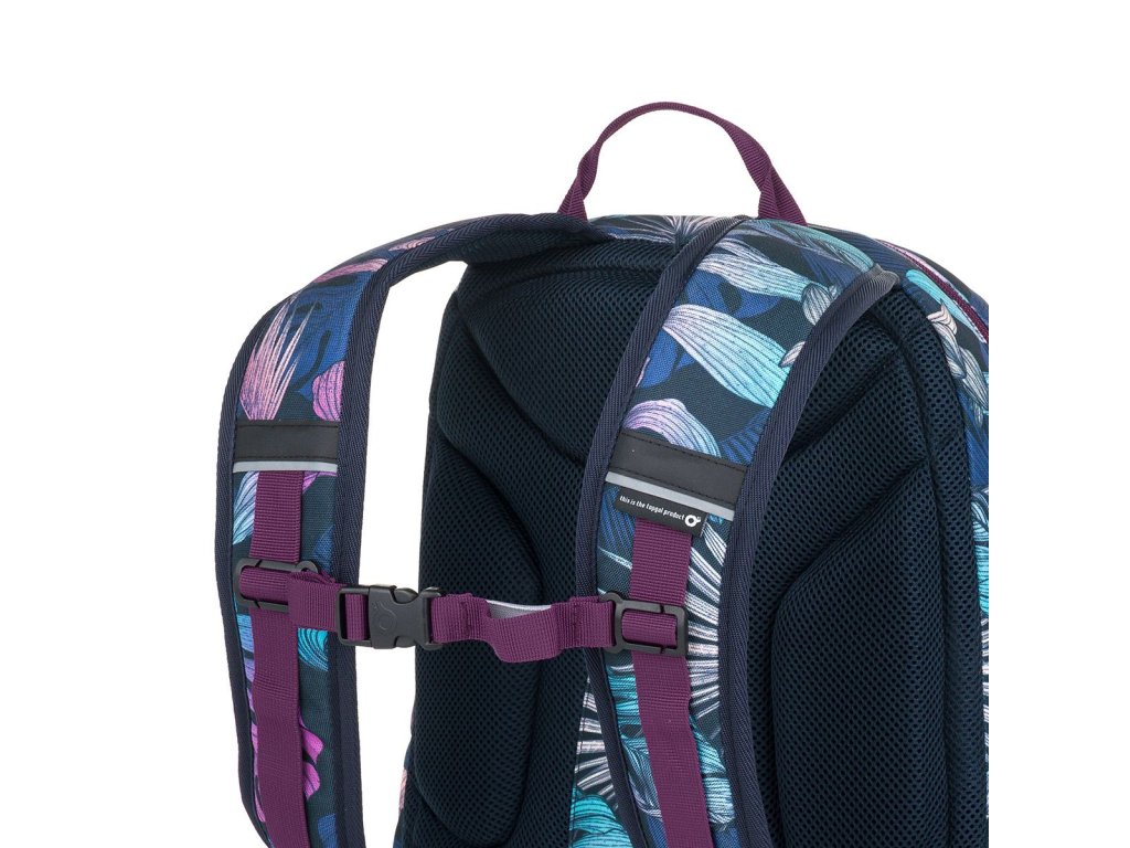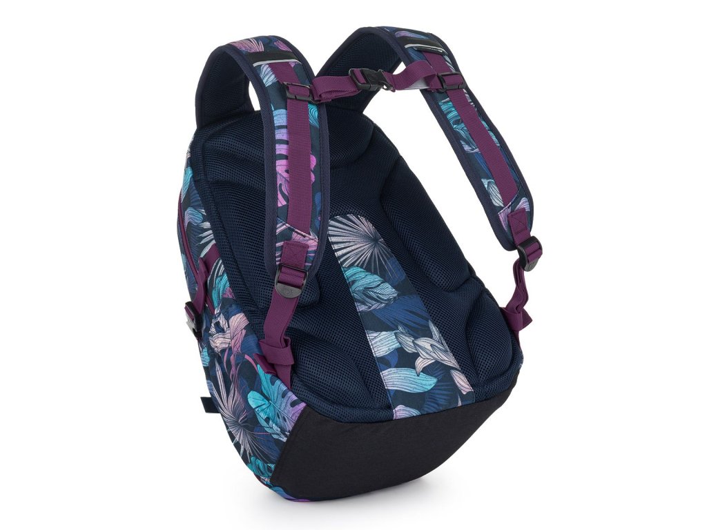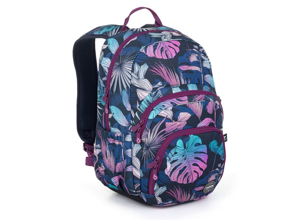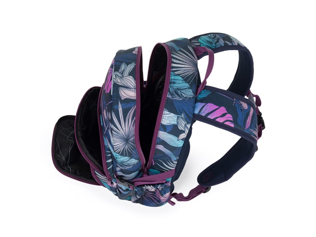 Jednokomorový batoh s barevnými listy monstery a stylovou nášivkou. Záda batohu jsou polstrovaná, anatomicky tvarovaná s lehkou hliníkovou výztuhou. Uvnitř komory je umístěna polstrovaná kapsa na notebook, klíčenka a síťovaná kapsa na zip.