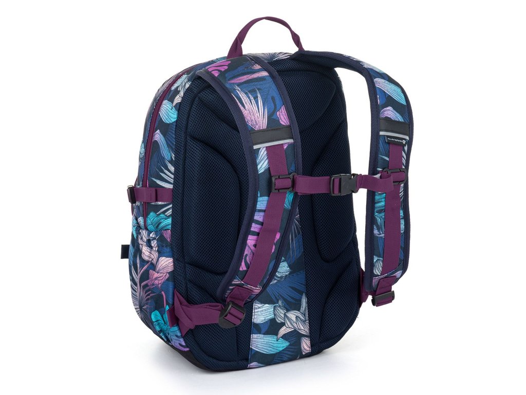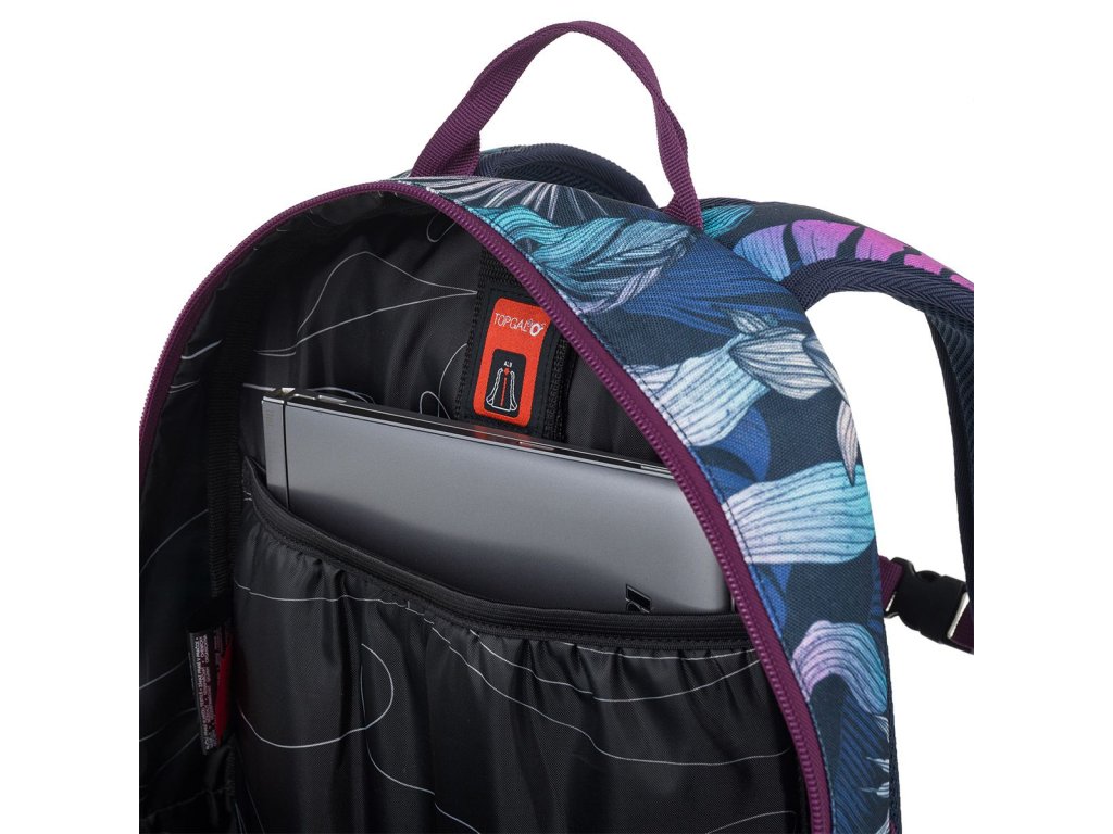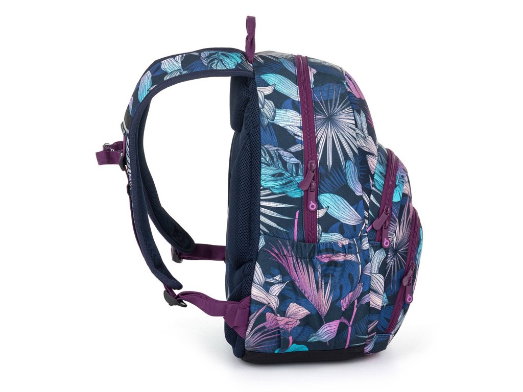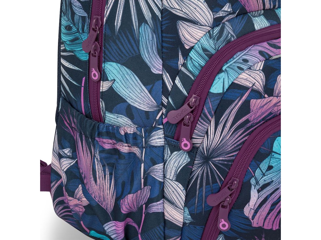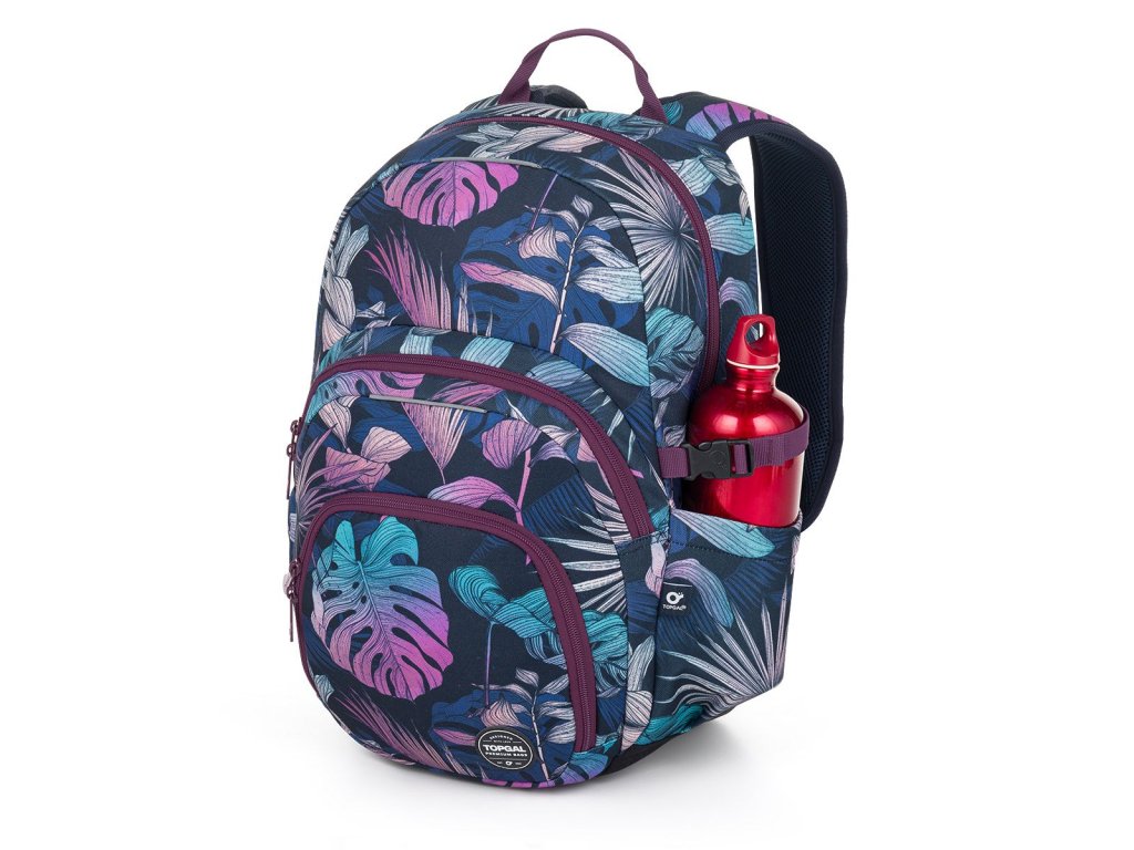 Jednokomorový batoh s barevnými listy monstery a stylovou nášivkou. Záda batohu jsou polstrovaná, anatomicky tvarovaná s lehkou hliníkovou výztuhou. Uvnitř komory je umístěna polstrovaná kapsa na notebook, klíčenka a síťovaná kapsa na zip.