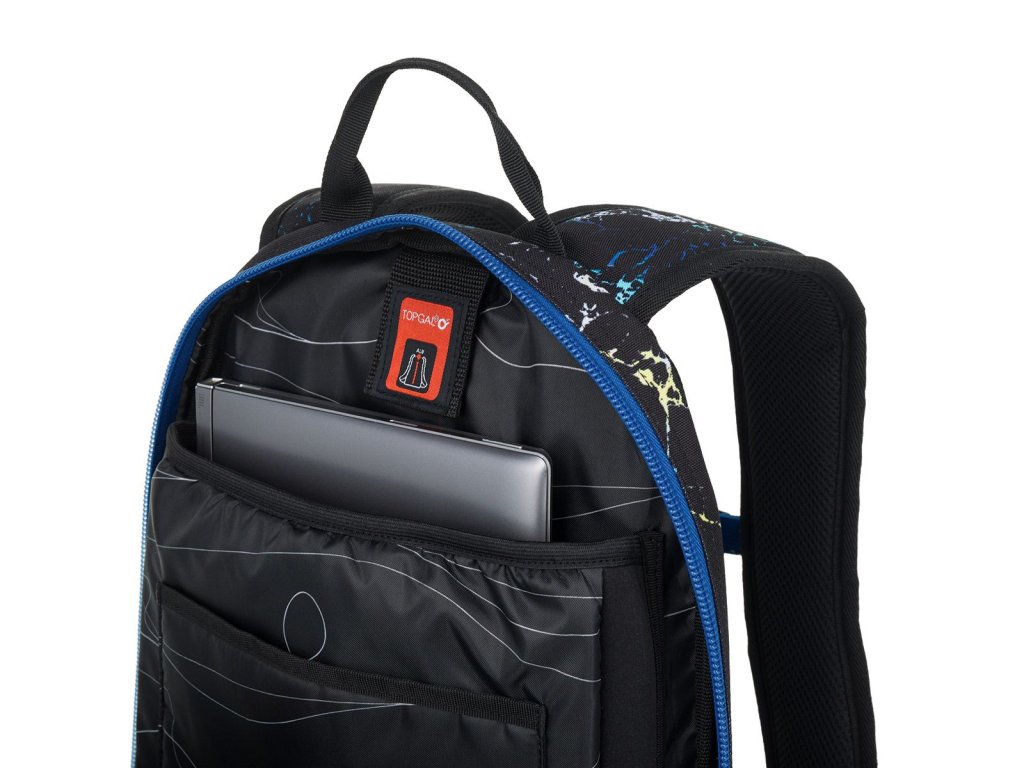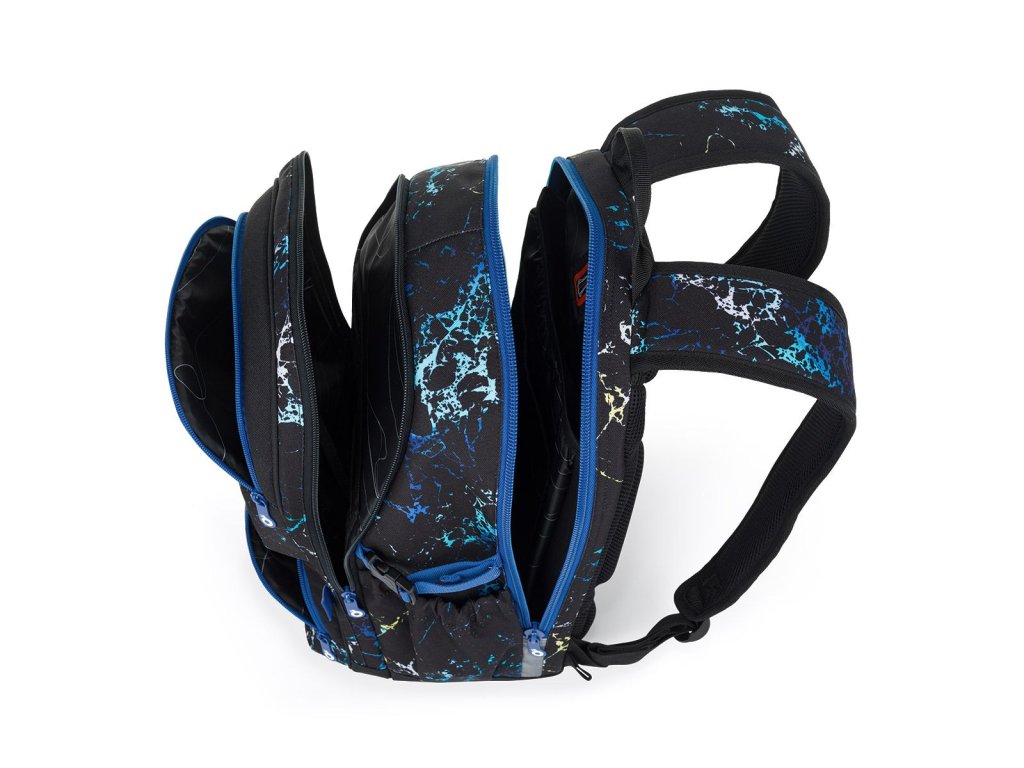 Zadní komora je větší než přední, dejte do ní to nejtěžší učivo. V zadní komoře jsou dvě polstrované kapsy. Do nich můžete umístit buď notebook o velikosti do 15,4” nebo třeba složky či sešity A4, aby se nepomačkaly. Menší polstrovaná kapsička je ideální na mobil, powerbanku nebo tablet či jinou drobnous, kterou byste neradi přenášením v batohu poškodili. V přední komoře je pak praktická síťová kapsa na zip na všechny drobnosti, co je dobré mít po ruce.