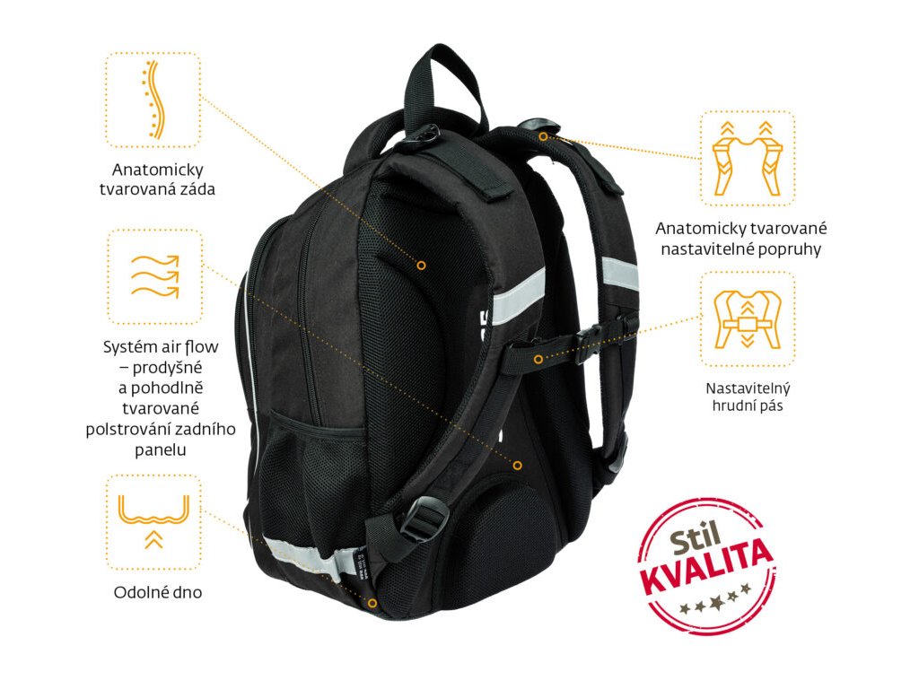 Kvalitní, ergonomicky tvarovaný, odlehčený školní batoh je vybaven reflexními prvky a anatomicky tvarovanými zády s pevnou konstrukcí.