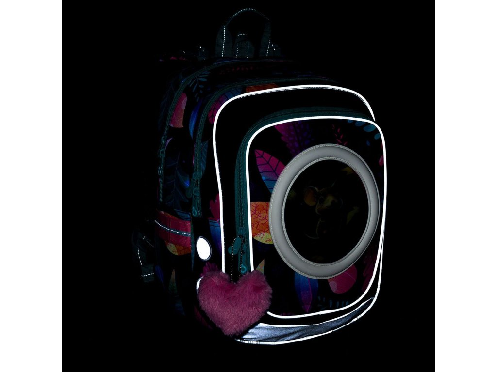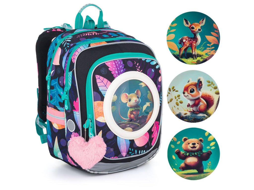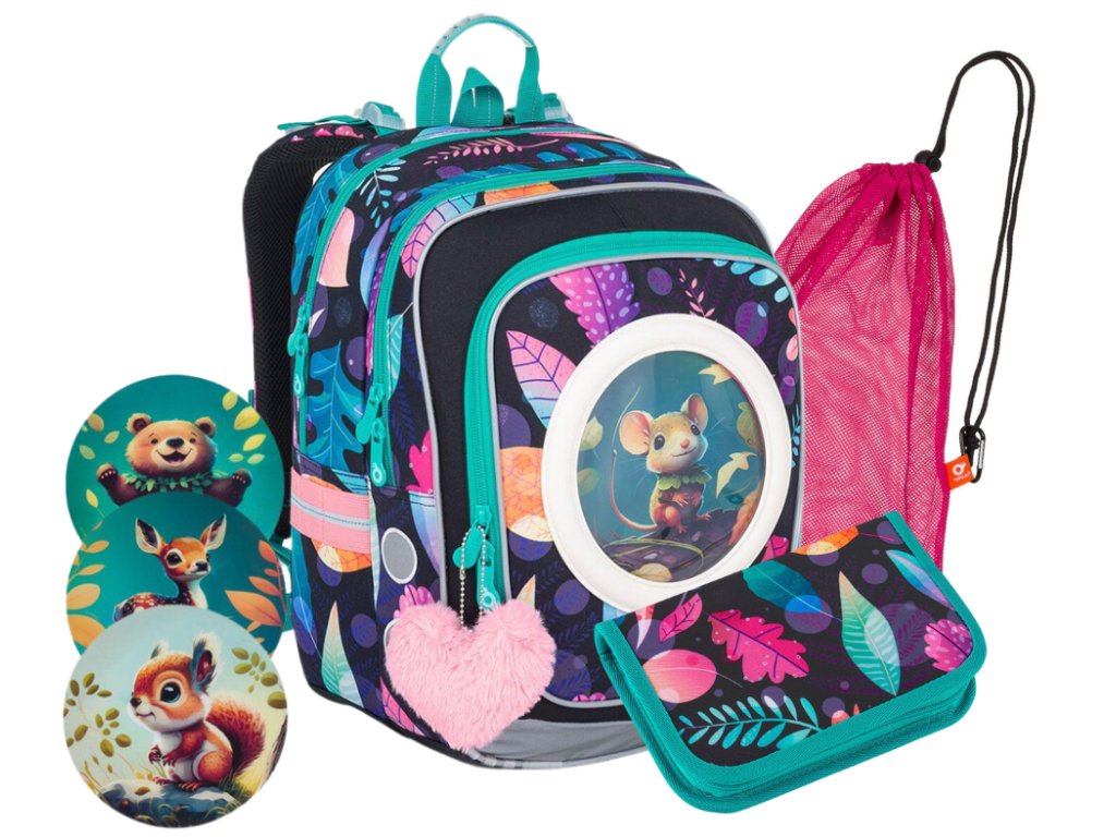 Model ENDY neváží ani kilogram, proto je ideální pro holčičky s výškou od 110 cm od první až třetí třídy ZŠ. Součástí batohu jsou čtyři obrázky s myškou, srnkou, medvědem a veverkou. Hravý design doplní plyšový přívěsek ve tvaru srdce.