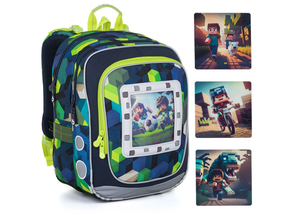 Ultralehký dvoukomorový batoh s vyměnitelnými obrázky Minecraft pro kluky s výškou od 110 cm. Součástí hravého batohu jsou čtyři obrázky, které můžete měnit dle libosti.