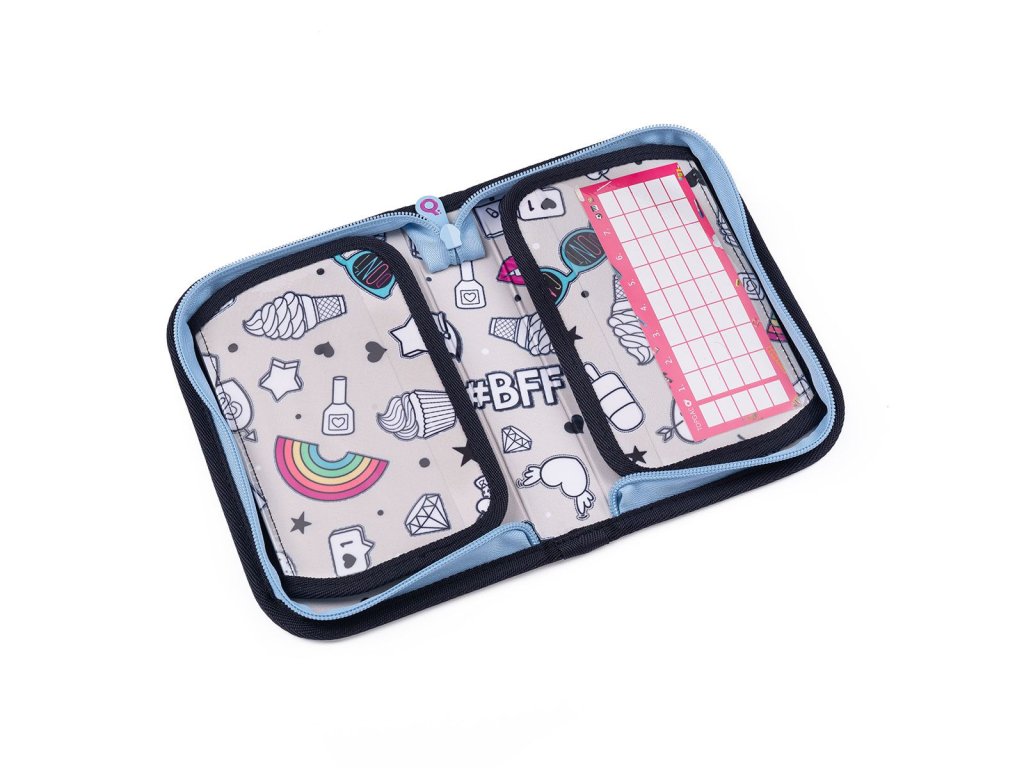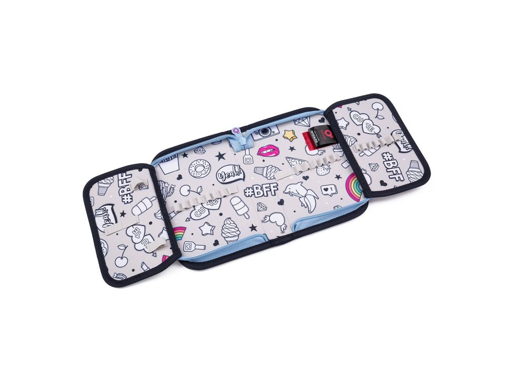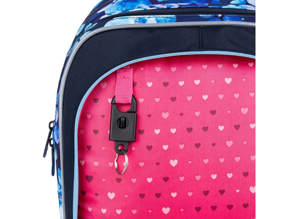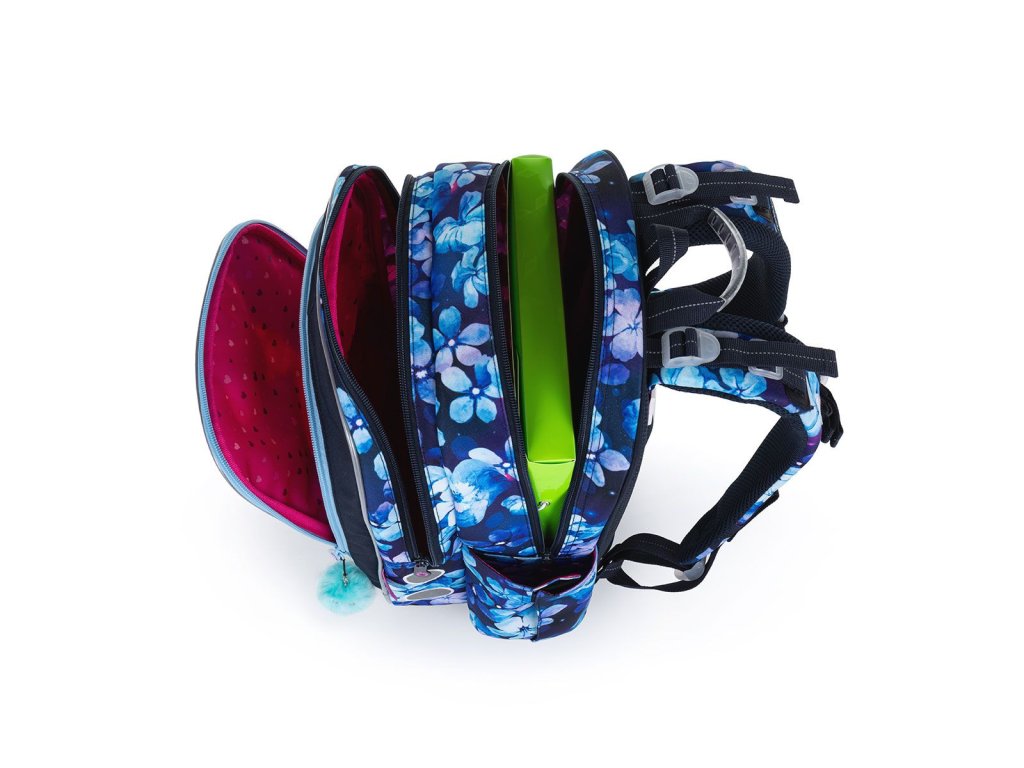Batoh má dvě objemné hlavní komory. Zadní komora je širší - doporučujeme k zádům dávat nejtěžší učebnice nebo desky na sešity. Přední komora je o něco užší a je v ní umístěna ještě malá síťová kapsa na zip a jmenovka.