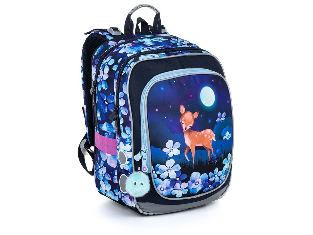 Tmavě modrý dvoukomorový batoh s motivem malé srnky, třpytivými kamínky a plyšovým přívěskem se bude dobře nosit nejen těm nejmenším dětem.