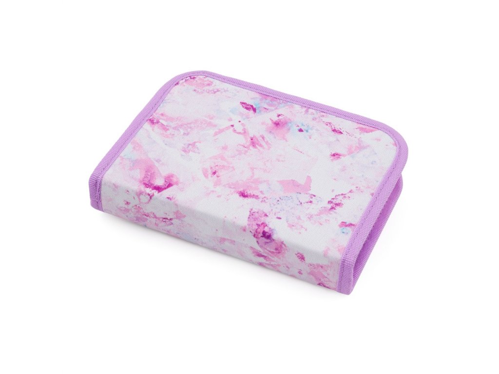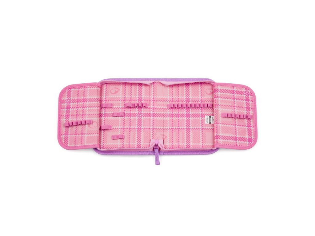 - Otevřením chlopní školačka rozbalí celou řadu pružných gumových úchytů na tužky, pastelky, fixy, kružítko, gumu i ořezávátko.