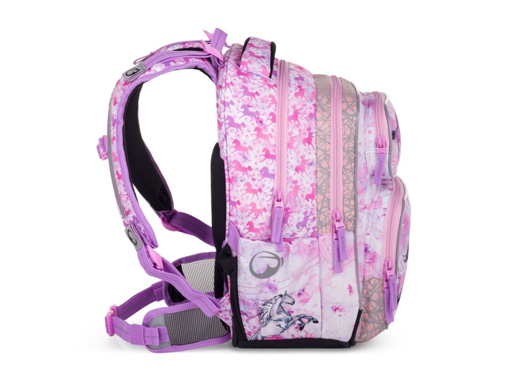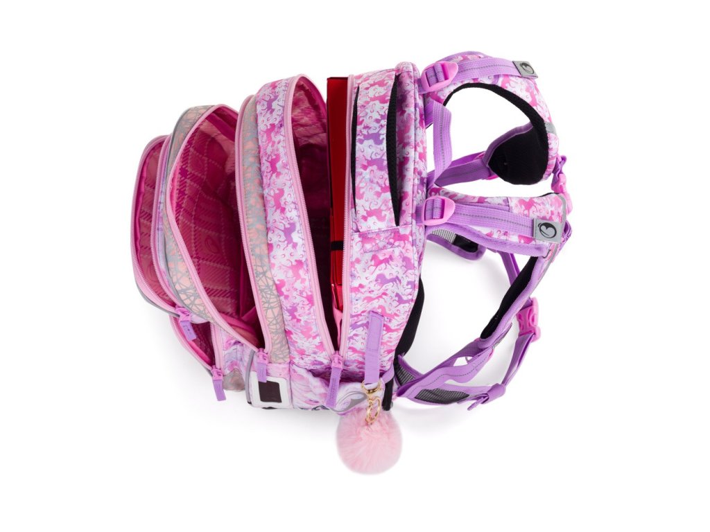 - Drobnější věci si může školačka schovat do kapsy na zip, která je přes celou šířku horní části vaku.