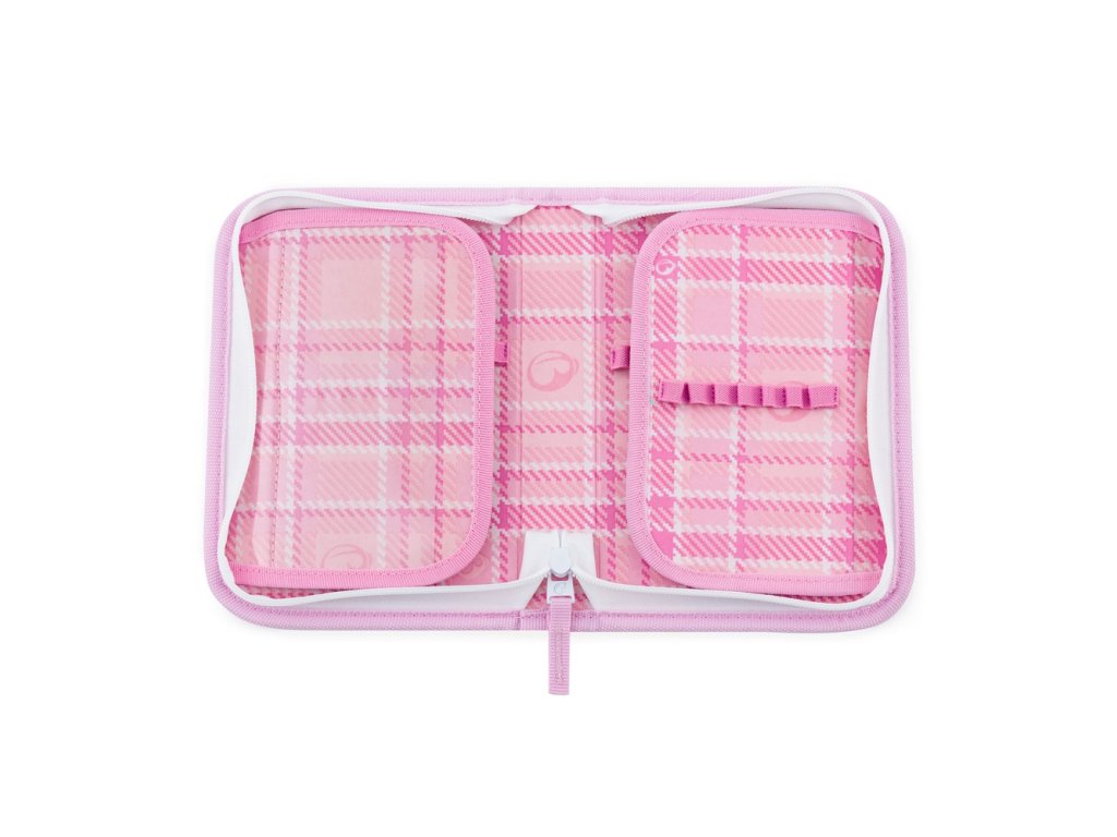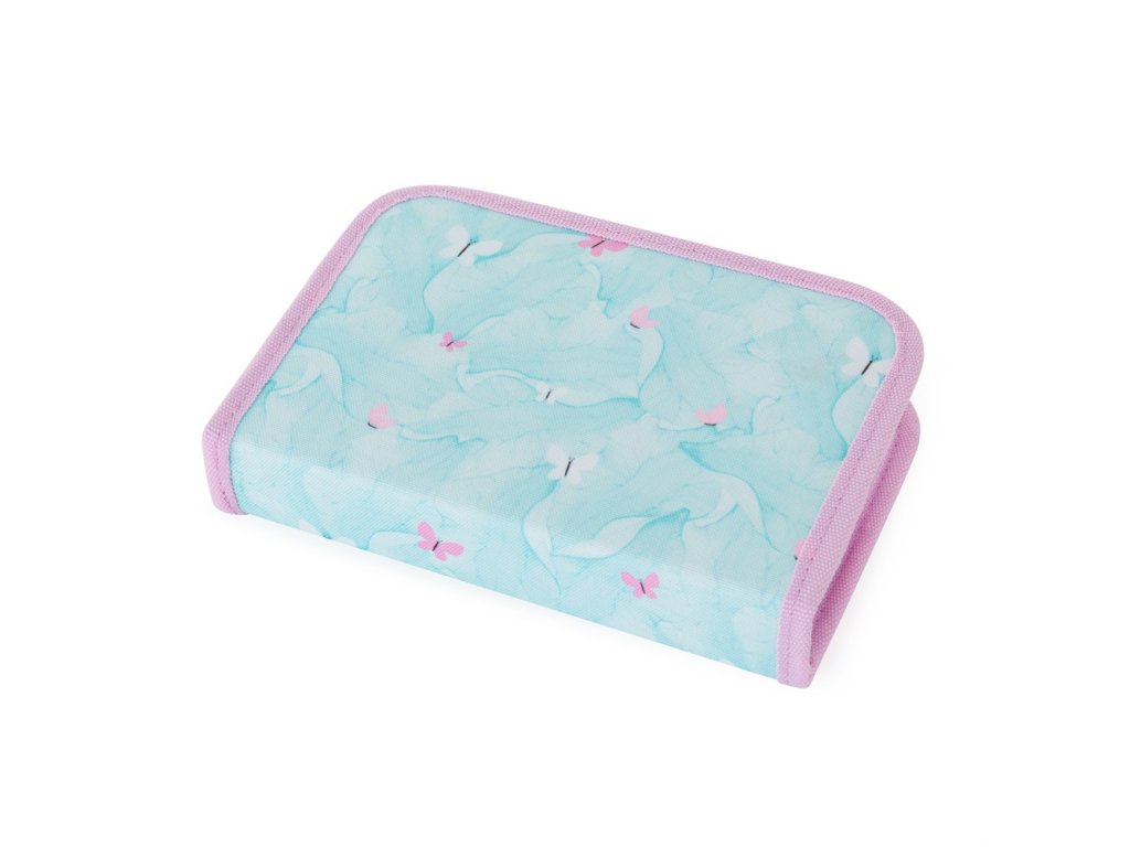 - Na dvou otevíravých chlopních je 35 pružných gumových úchytů na pastelky, pera, fixy, gumu, nůžky, kružítko a další pomůcky.