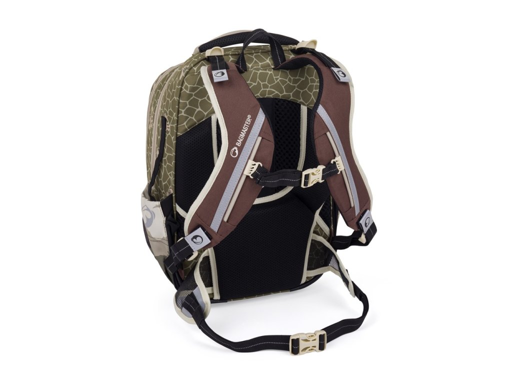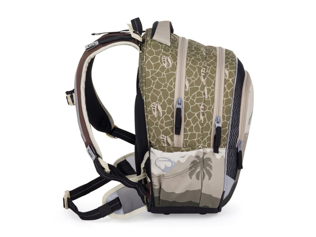 - Lehký a vyjímatelný bederní pás je vyrobený z prodyšné síťoviny. Školák se pod ním nepotí, ani mu bederák nevytváří kolem těla „pneumatiku“. Navíc je opatřený reflexními prvky. Díky bedernímu pásu se váha batohu rozloží z ramenou také na bedra.