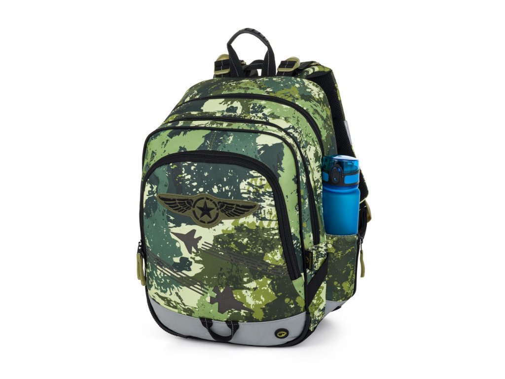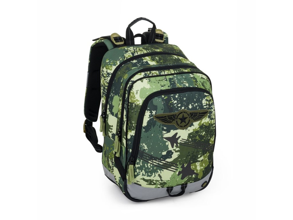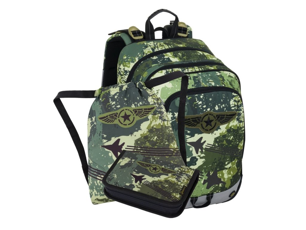 Lehký tříkomorový školní batoh s vojenským motivem pro malé hrdiny. Oblíbí si jej děti i rodiče. Vhodný od první do třetí třídy. Kvalitní systém pro zdravá záda, organizér a praktické kapsy, do kterých si školák přehledně uspořádá učebnice i pomůcky. Set obsahuje sladěný penál a sáček.