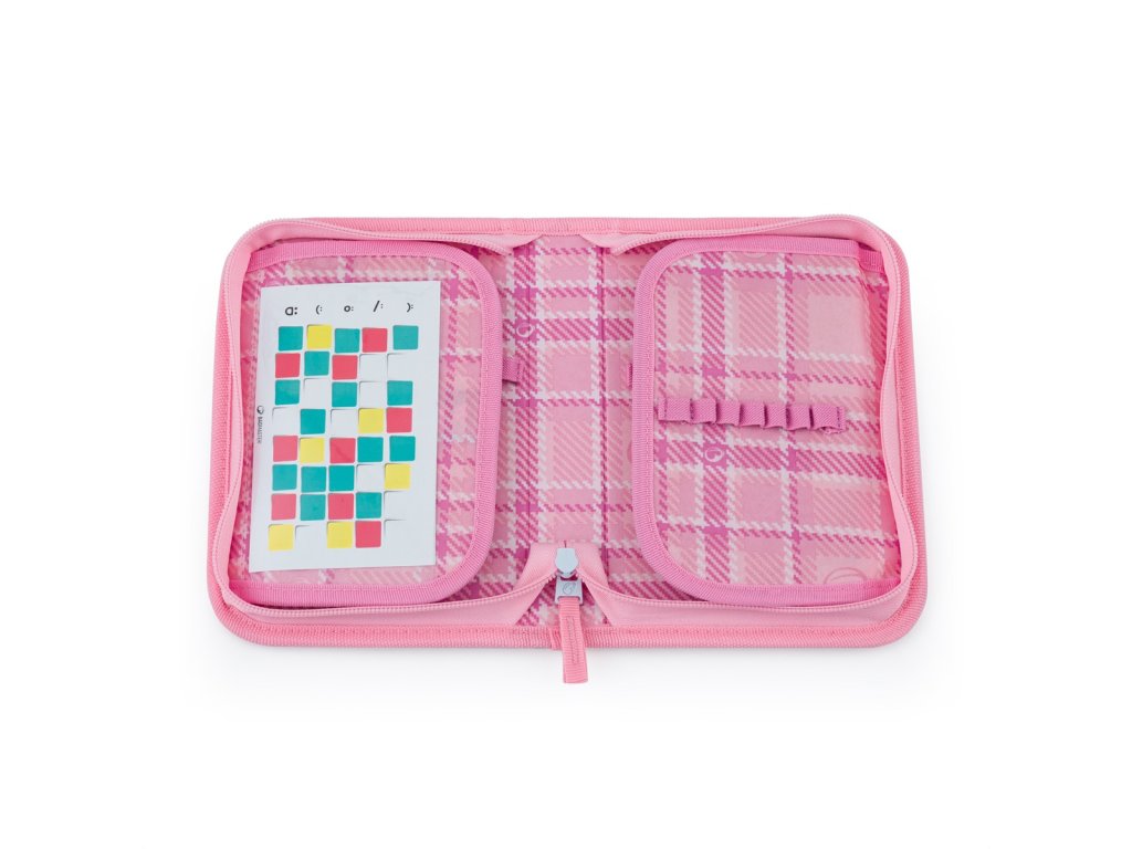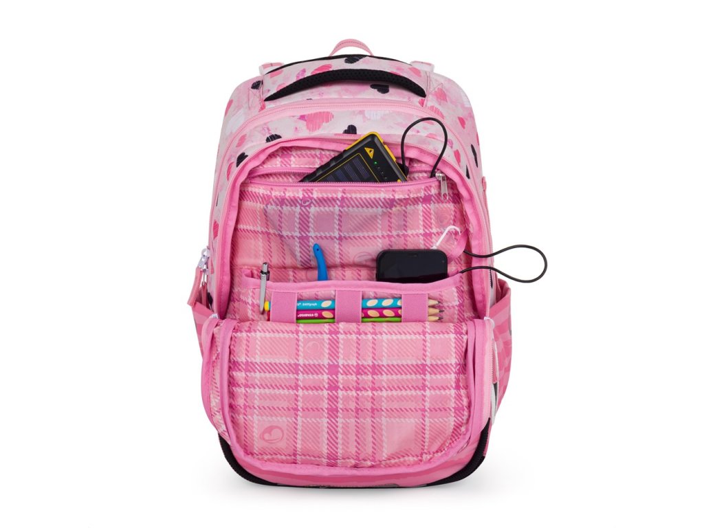 - Na černou přezku v přední kapse můžete školačce připnout síťovaný sáček. Třeba na peníze nebo sluchátka. Do kapsičky na zip se vejde power banka. Nabíjecí kabel stačí otevřeným rožkem protáhnout k telefonu umístěnému v organizéru.
