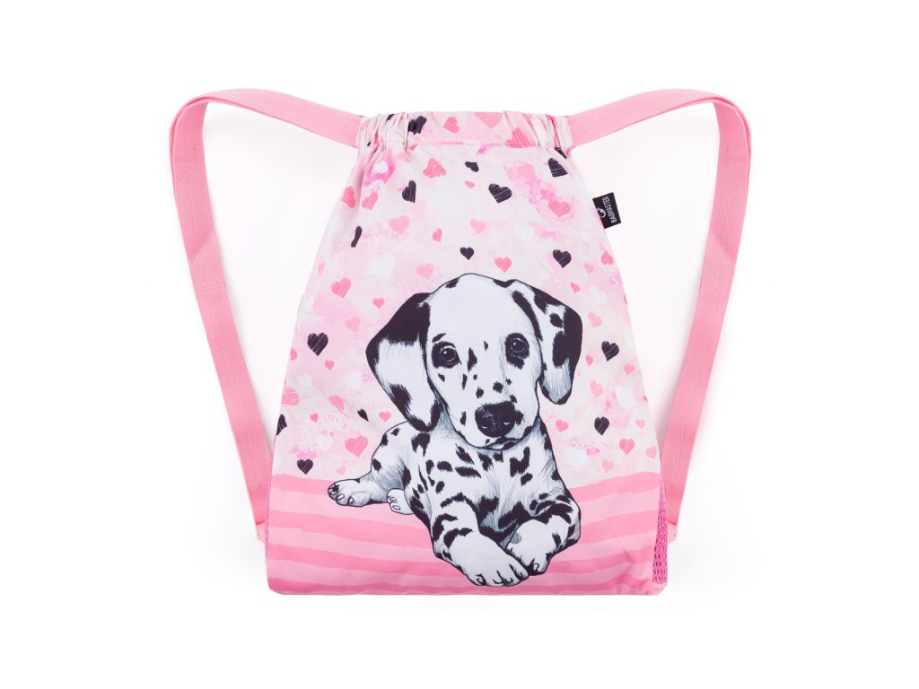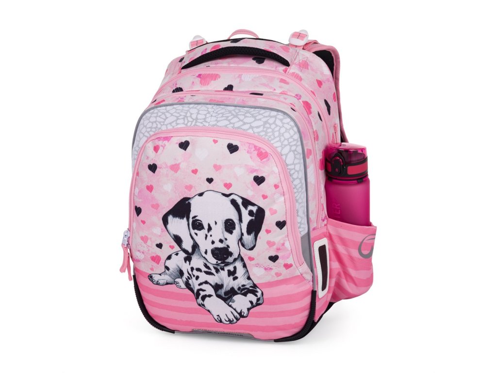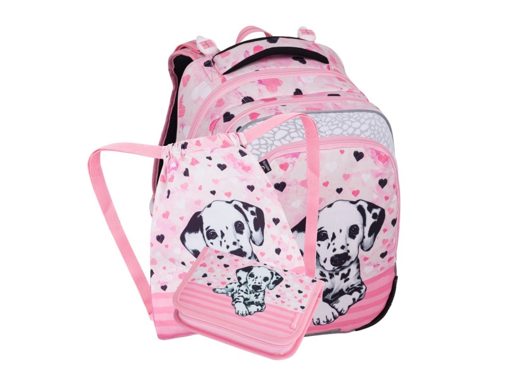 Batoh pro malé školačky od 1. do 3. třídy s dalmatinem. Zaujme nejen svým designem, ale také lehkostí – váží pouhých 0,98 kg. Uvnitř jsou tři velké komory a organizér na cennosti. Batoh s motivem dalmatina stojí na plastových nožkách, ve tmě chrání svými reflexními prvky. Zádový systém s hrudním pásem a bederním pásem má zdravotní posudek. K batohu bude školačce ladit penál na psací potřeby a látkový vak na přezůvky nebo školní úbor.