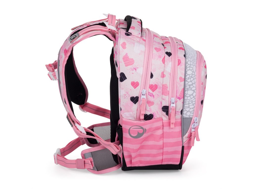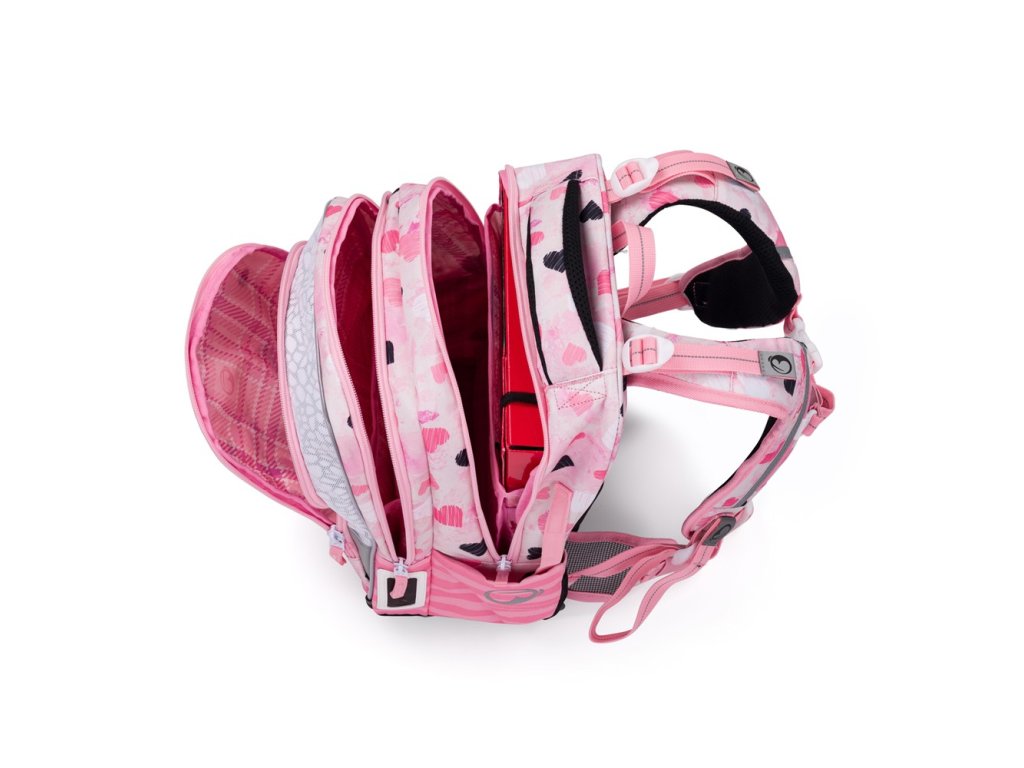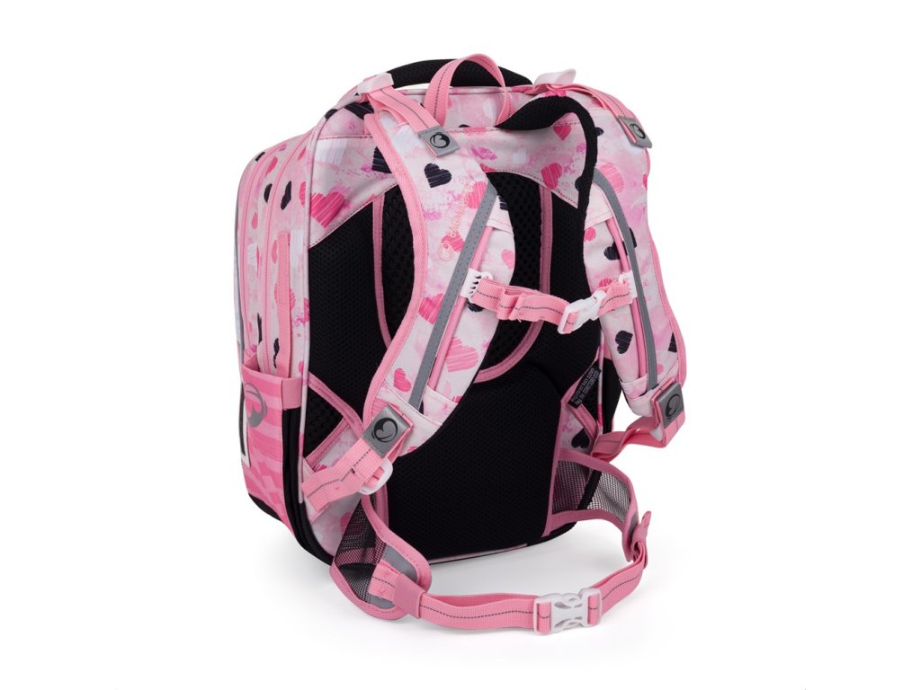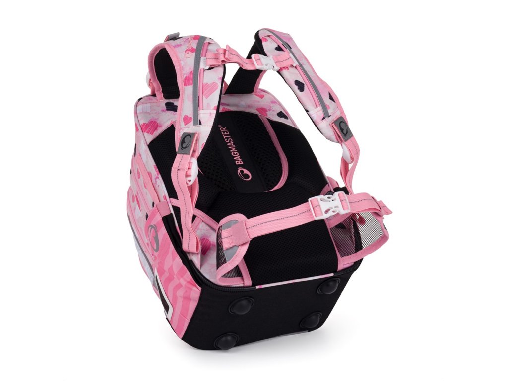 - Ramenní popruhy i zádový systém jsou měkce polstrované. Popruhy se nastavují pomocí horních a dolních plastových spon. Je třeba upravovat délku podle toho, jak školačka roste. Konce popruhů jsou magnetické. Aby neblincaly, jednoduše je magnetem připnete nad plastovou sponu.
