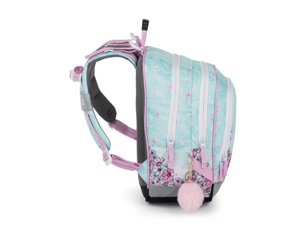 - Na bočním poutku visí přívěsek. Školačka si na poutko může připnout taky samonavíjecí klíčenku na školní čip nebo na karabinu s klíči. Aby důležité věci, které je potřeba mít neustále po ruce, nevisely z batohu a nelákaly zloděje, stačí je zasunout do boční kapsy.