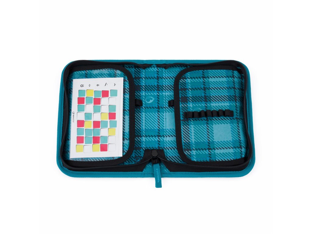 - Na černou přezku v přední kapse můžete školačce připnout síťovaný sáček. Třeba na peníze nebo sluchátka. Do kapsičky na zip se vejde power banka. Nabíjecí kabel stačí otevřeným rožkem protáhnout k telefonu umístěnému v organizéru.