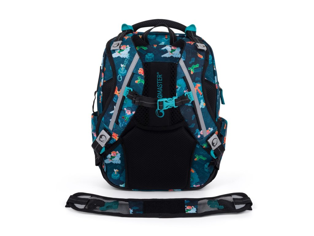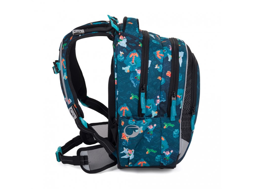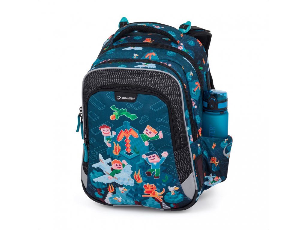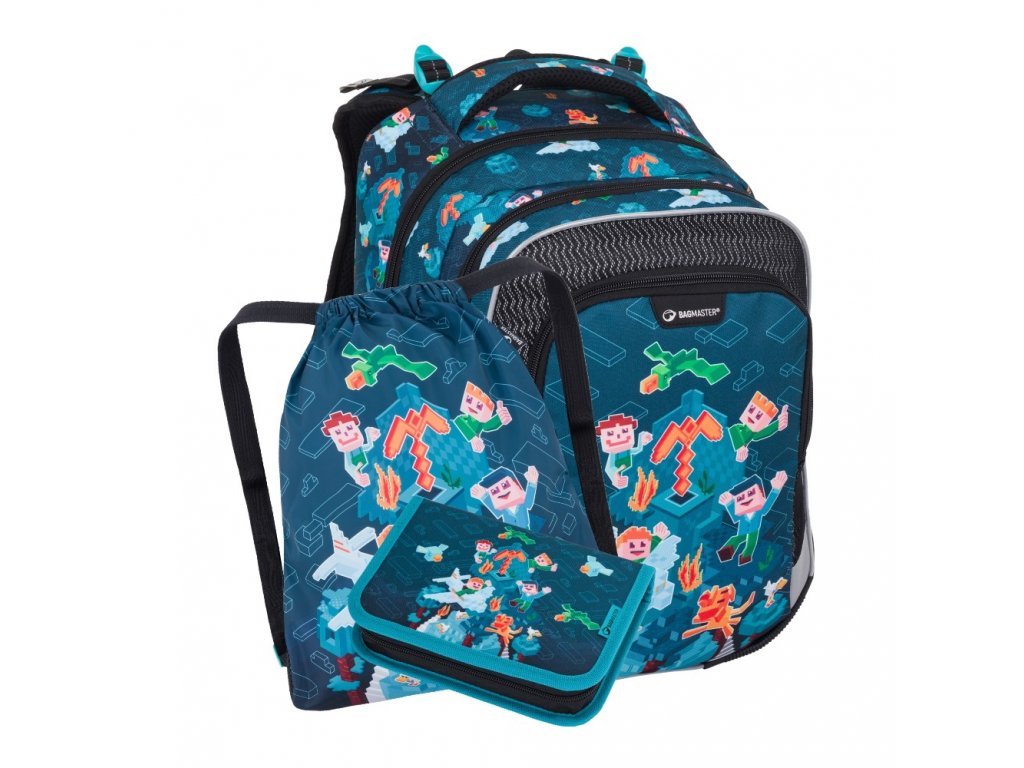 Školní set pro prvňáčky, kteří mají rádi kostičkový svět. Školní batoh váží necelý kilogram, má nový bezpečný zádový systém s bederním pásem, reflexní prvky, praktický organizér i boční kapsu na pití. Síťovina na anatomicky tvarovaných popruzích a zádové části je měkká a neškrábe. Součástí setu je látkový sáček a penál.