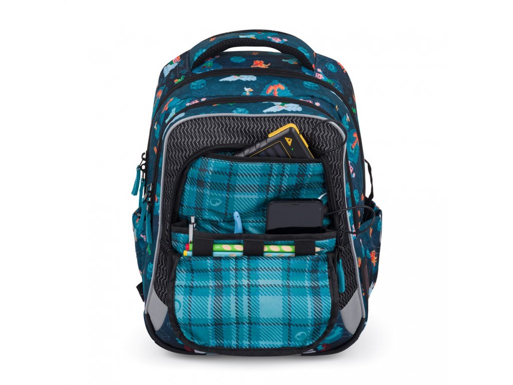 - Má tři prostorné komory. Do hlavní se vejdou velké školní desky i učebnice a sešity formátu A4.