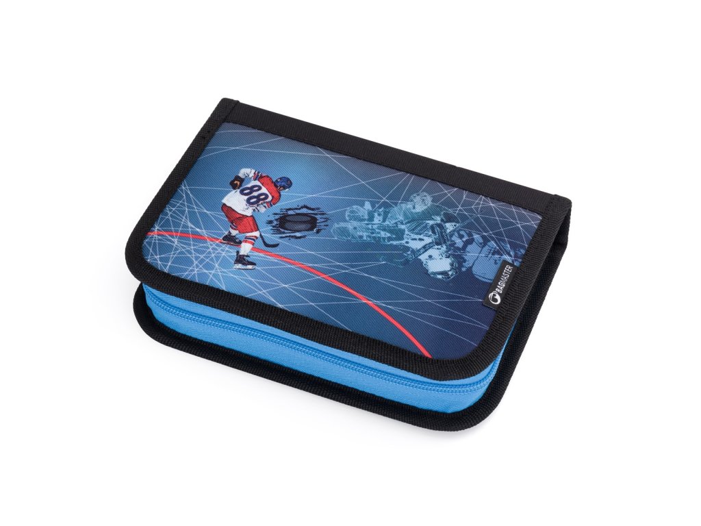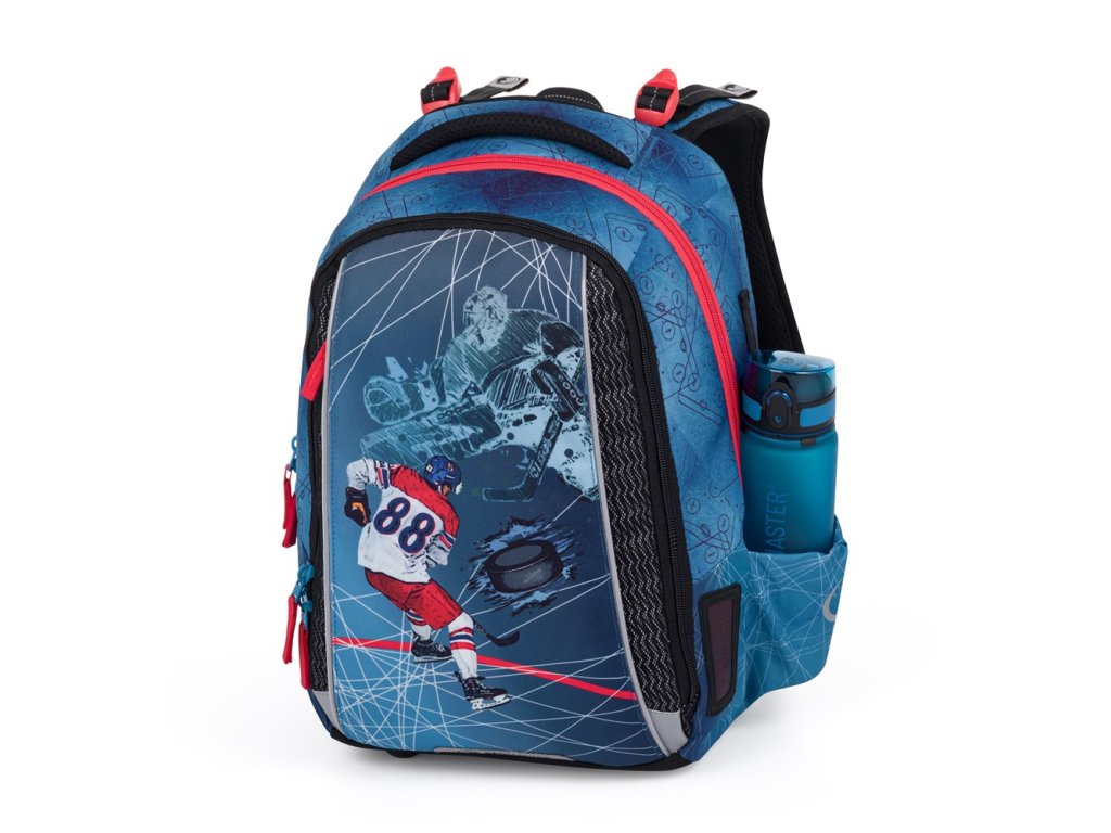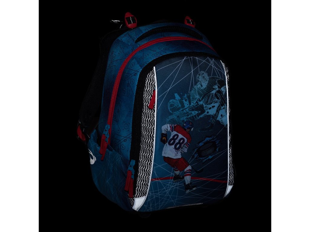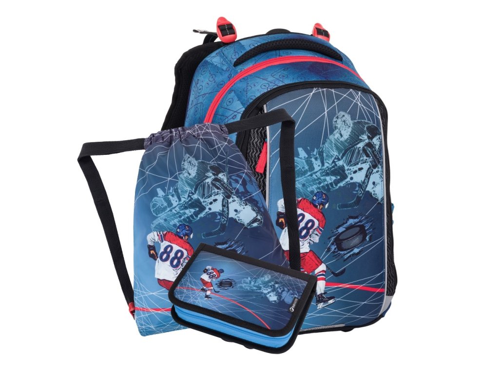 Set s hokejovým motivem pro malé školáky od 1. do 3. třídy. Školní batoh je navržen s ohledem na drobné postavy školáků. Přesto je batoh prostorný, uvnitř jsou dvě komory. Hlavní komora pojme velké desky a učebnice, díky kompresní kapse s elastickými pásy zůstanou těžké pomůcky blízko zad. Správnému držení těla pomáhají také ergonomicky tvarovaná záda a bederní pás. Batoh s motivem ledního hokeje stojí na plastových nožkách a je opatřen reflexními prvky.