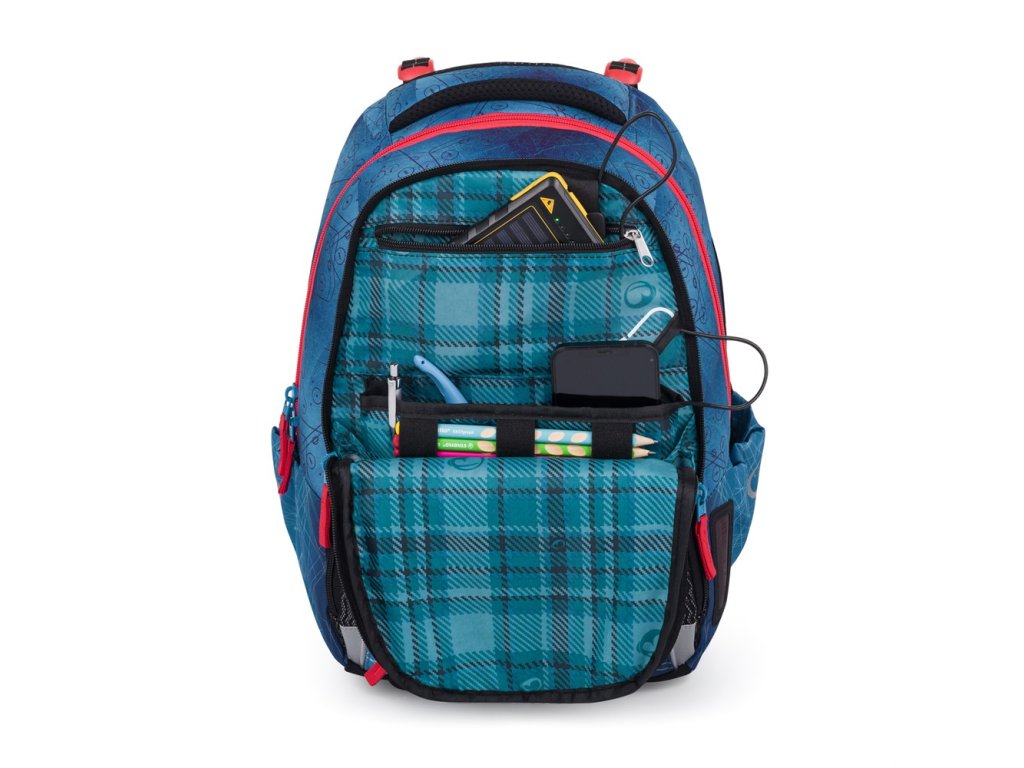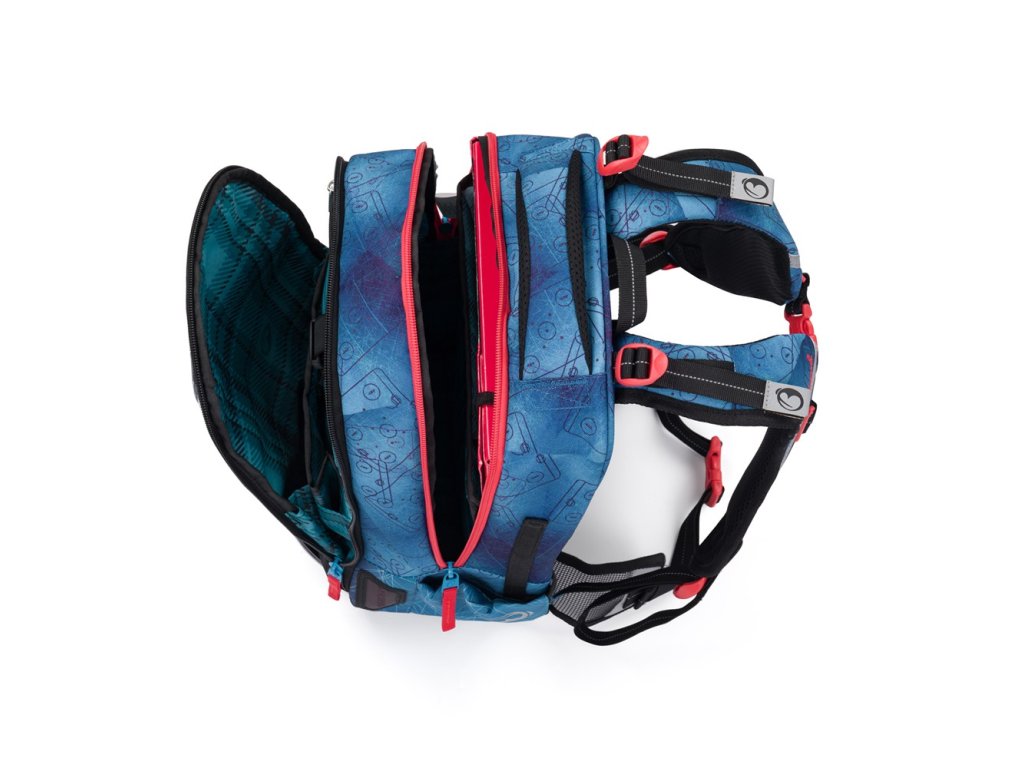 - Má dvě prostorné komory. Do hlavní se vejdou velké školní desky i učebnice a sešity formátu A4. V hlavní komoře je kompresní kapsa s elastickými postranními pásy na desky A4 a na velké učebnice.