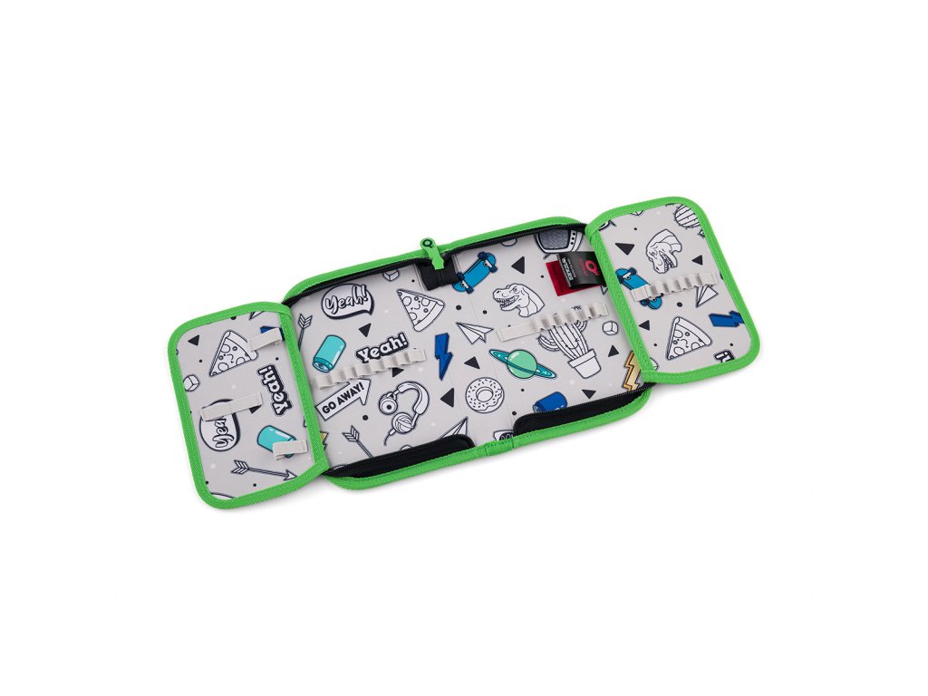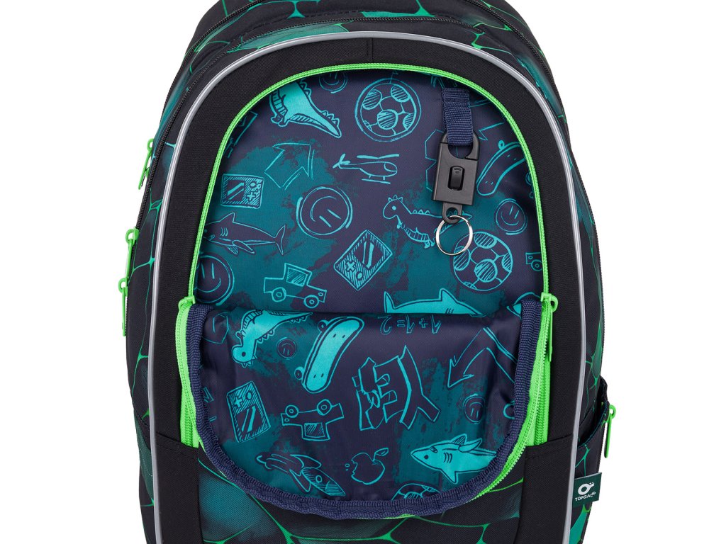 Dvě hlavní objemné komory batohu pojmou všechno potřebné učení. Zadní komora je užší než přední, radíme do ní umístit nejtěžší učivo a směrem dopředu odlehčovat. V přední, širší komoře, je umístěna síťová kapsa na zip a jmenovka. Na čele batohu pak určitě využijete i praktickou hlubokou kapsu, třeba na přenášení svačinky, nebo penálu PENN 22018 ve stejném designu. V kapse je umístěna i odnímatelná karabina na klíče.