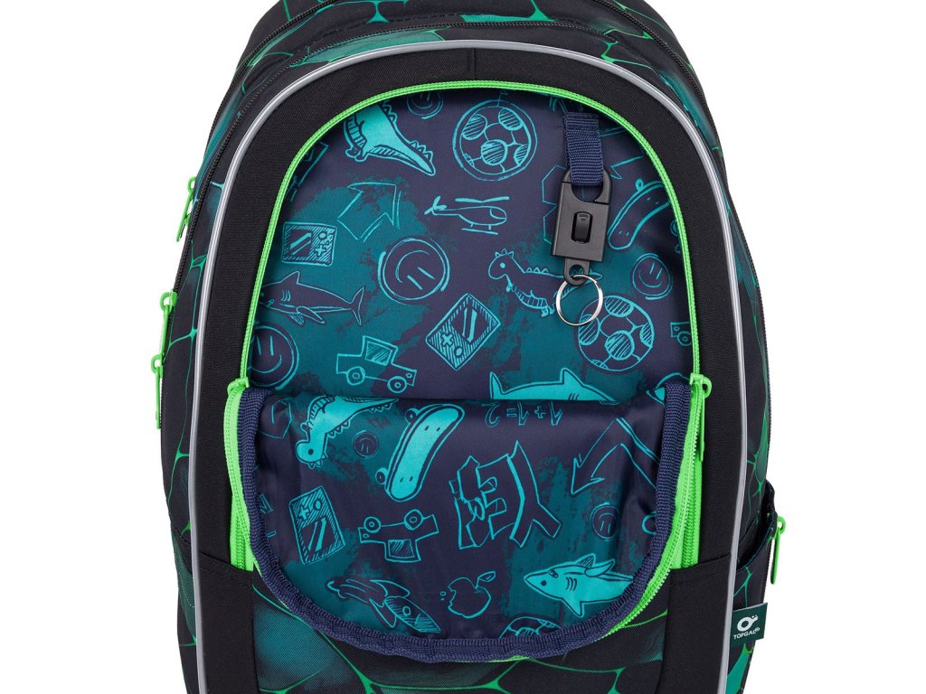 Dvě hlavní objemné komory batohu pojmou všechno potřebné učení. Zadní komora je užší než přední, radíme do ní umístit nejtěžší učivo a směrem dopředu odlehčovat. V přední, širší komoře, je umístěna síťová kapsa na zip a jmenovka. Na čele batohu pak určitě využijete i praktickou hlubokou kapsu, třeba na přenášení svačinky, nebo penálu PENN 22018 ve stejném designu. V kapse je umístěna i odnímatelná karabina na klíče.