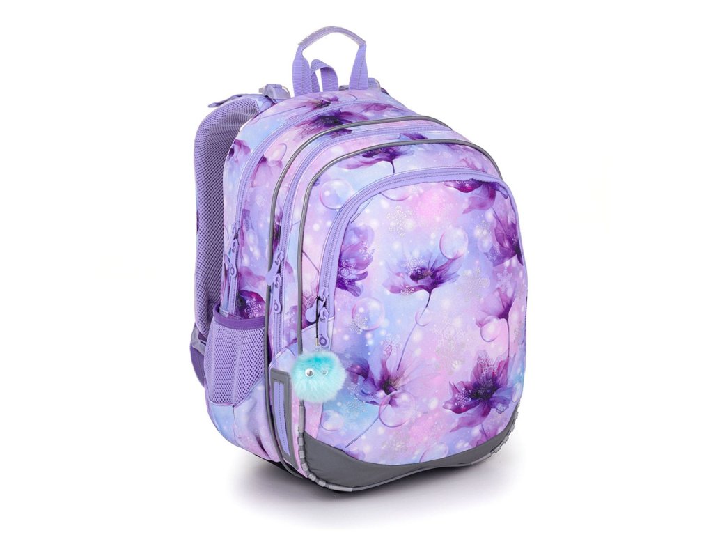 Lehoučký dvoukomorový batoh pro dívky na prvním stupni s motivem ptáčků, kytiček a s fialovými třpytkami. To je parádní kombinace pro školačky na prvním stupni ZŠ. Navíc neváží ani kilogram a pojme spoustu nákladu!