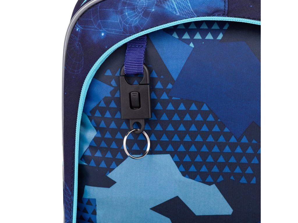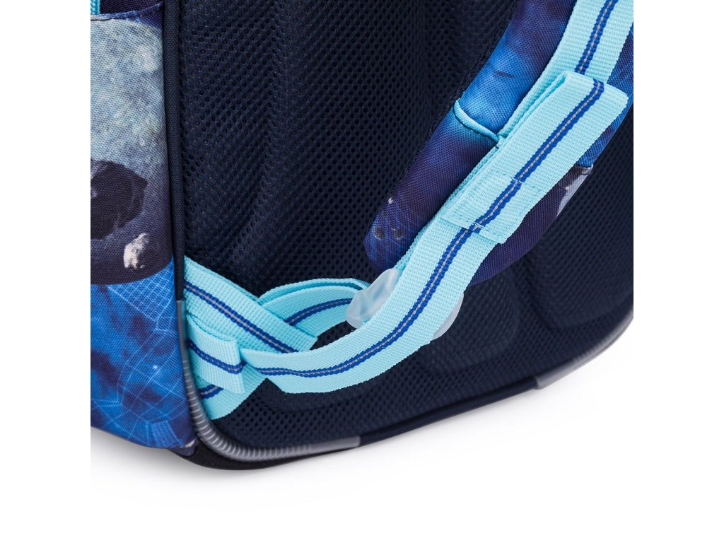 Batoh má dvě objemné hlavní komory. Do nejširší zadní komory dejte nejtěžší učebnice nebo desky na sešity, abyste rozložili váhu učiva. Přední komora je o něco užší, je v ní ukrytá malá síťová kapsa na zip a jmenovka.