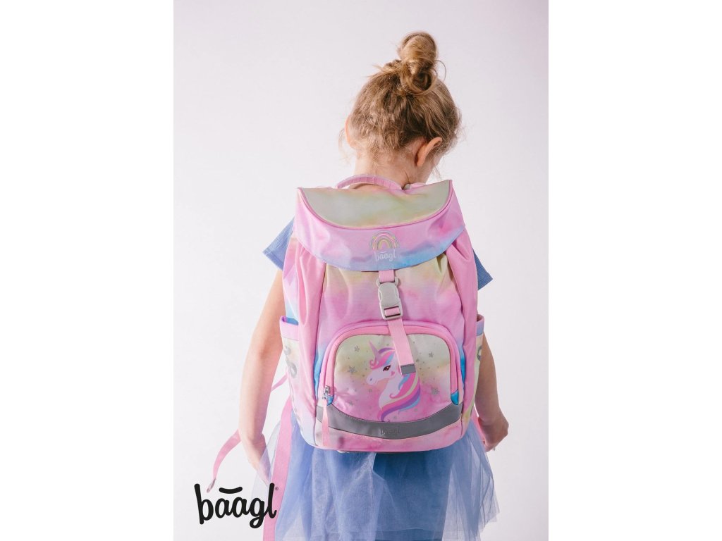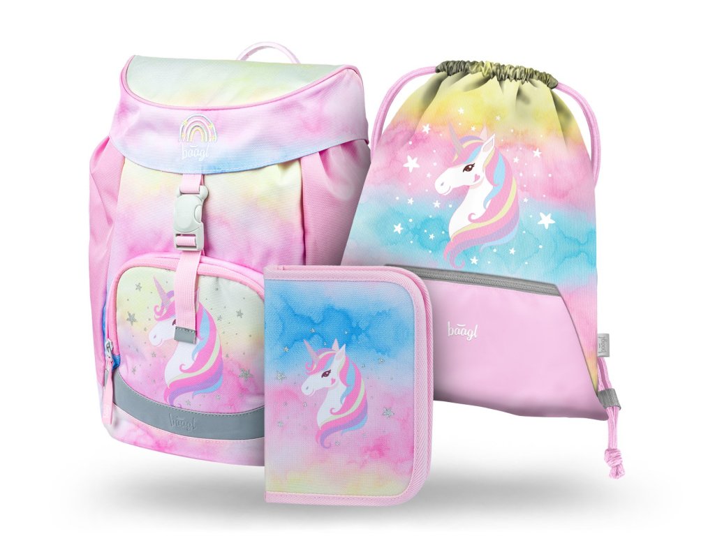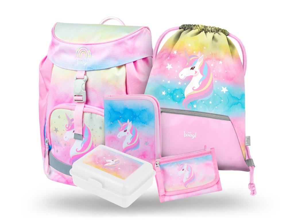 Školní batoh Baagl pro prvňáčky 650 g - set Airy Rainbow Unicorn II