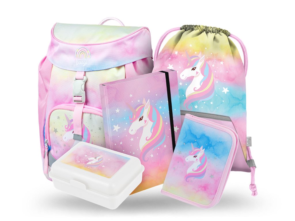 Školní batoh Baagl pro prvňáčky 650 g - set II Airy Rainbow Unicorn