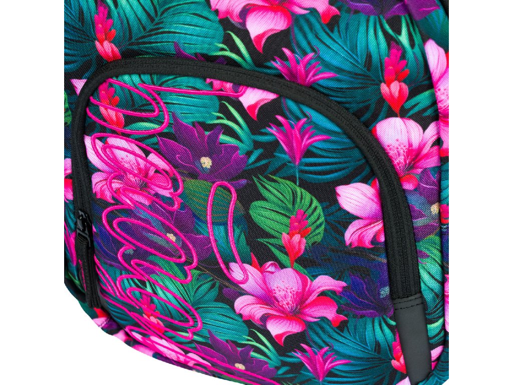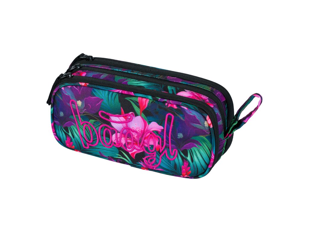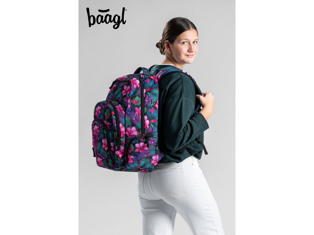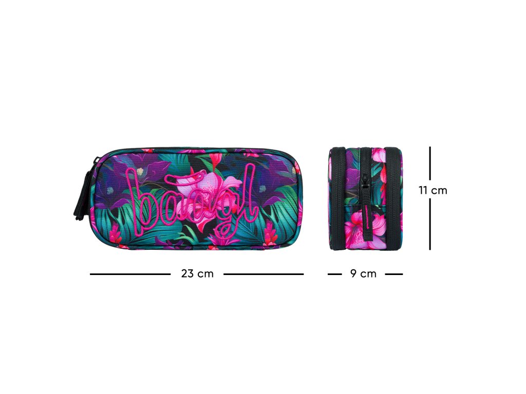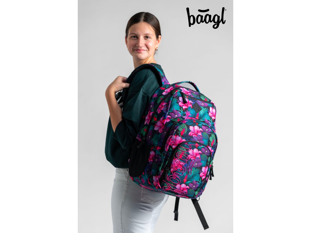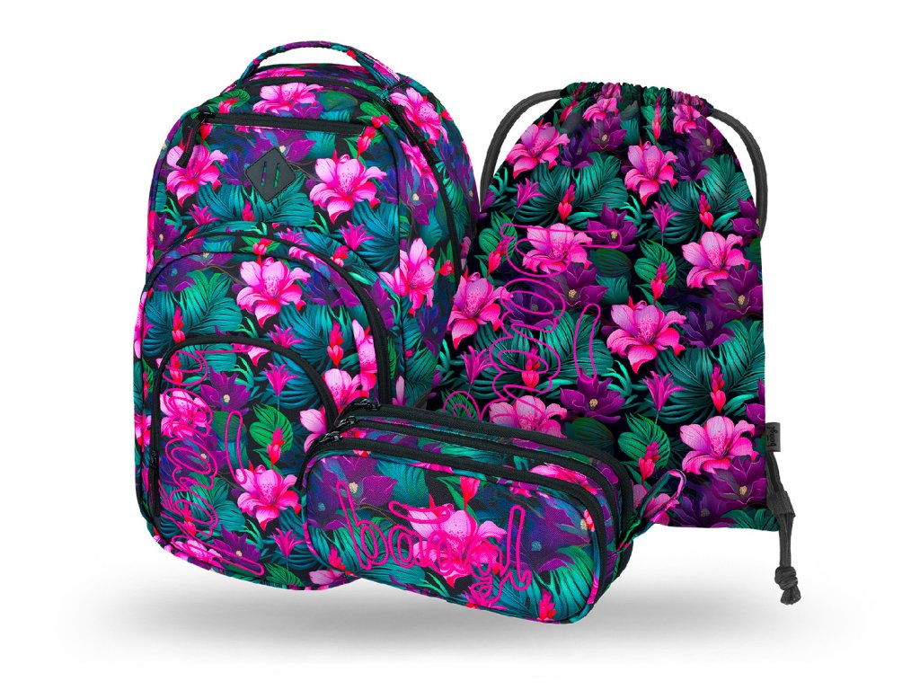 Zvýhodněný školní set zahrnující pestrobarevný batoh Coolmate, penál etue a praktický sáček na obuv s motivem tropických květin a logem BAAGL.