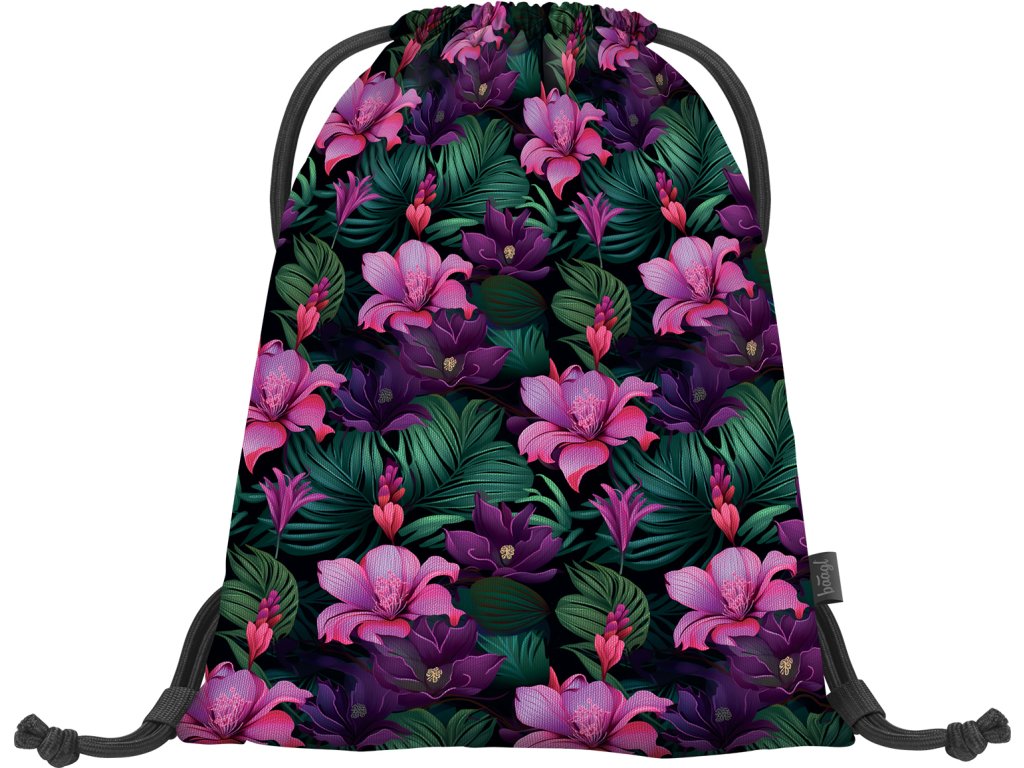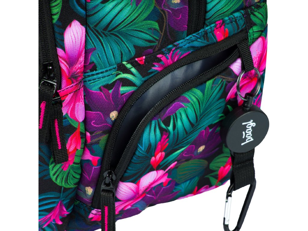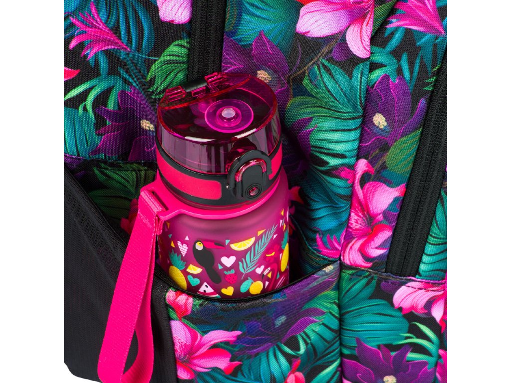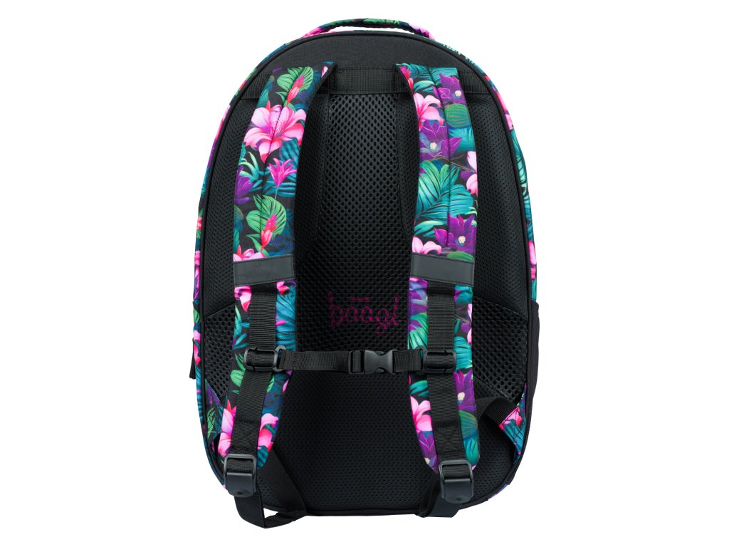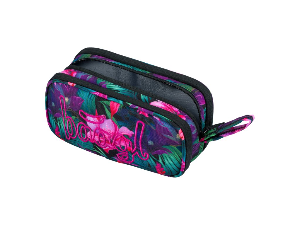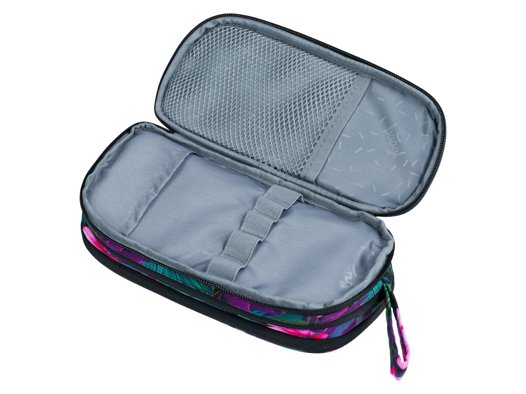 Zvýhodněný školní set zahrnující pestrobarevný batoh Coolmate, penál etue a praktický sáček na obuv s motivem tropických květin a logem BAAGL.