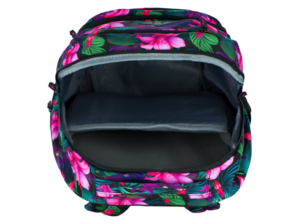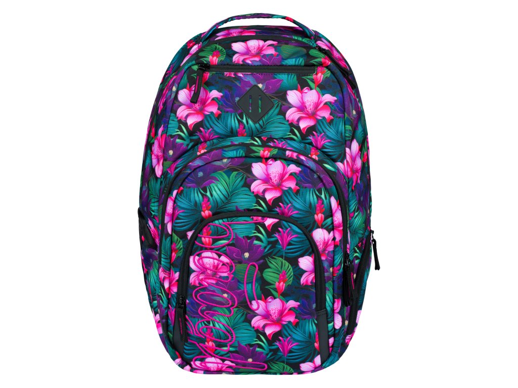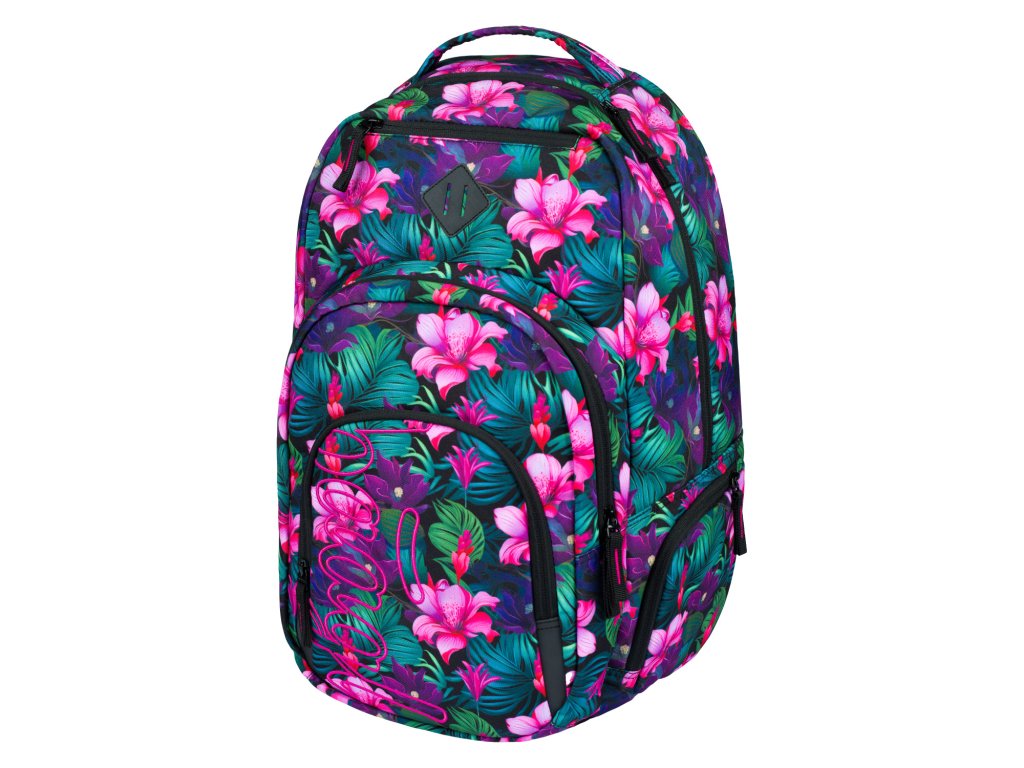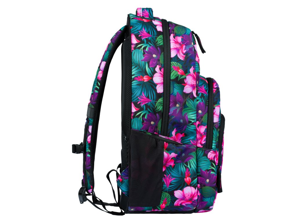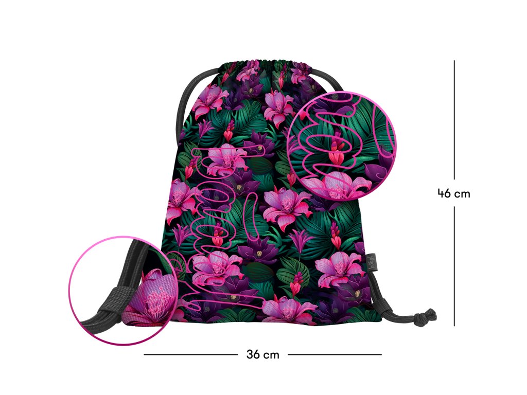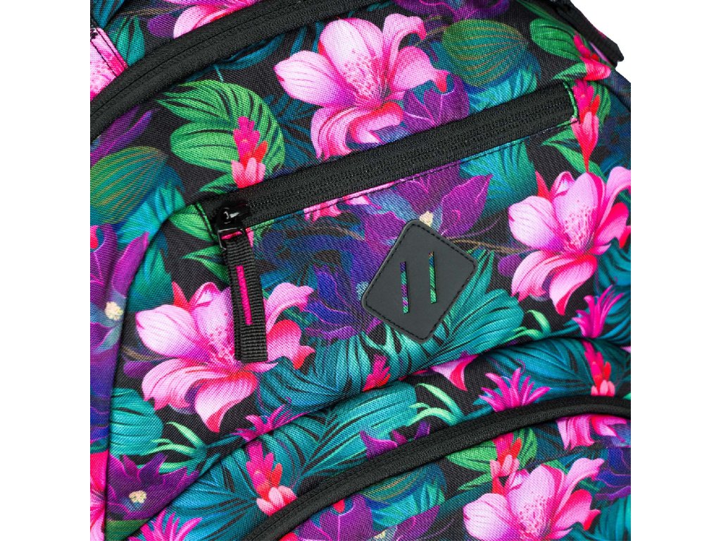 Zvýhodněný školní set zahrnující pestrobarevný batoh Coolmate, penál etue a praktický sáček na obuv s motivem tropických květin a logem BAAGL.