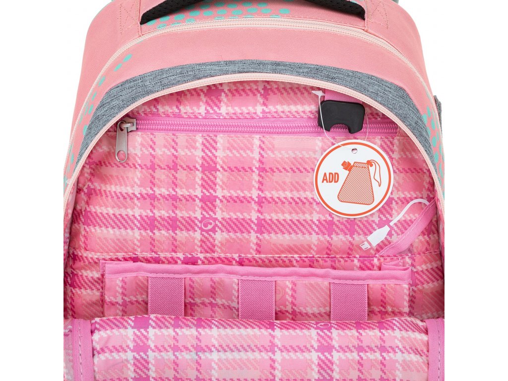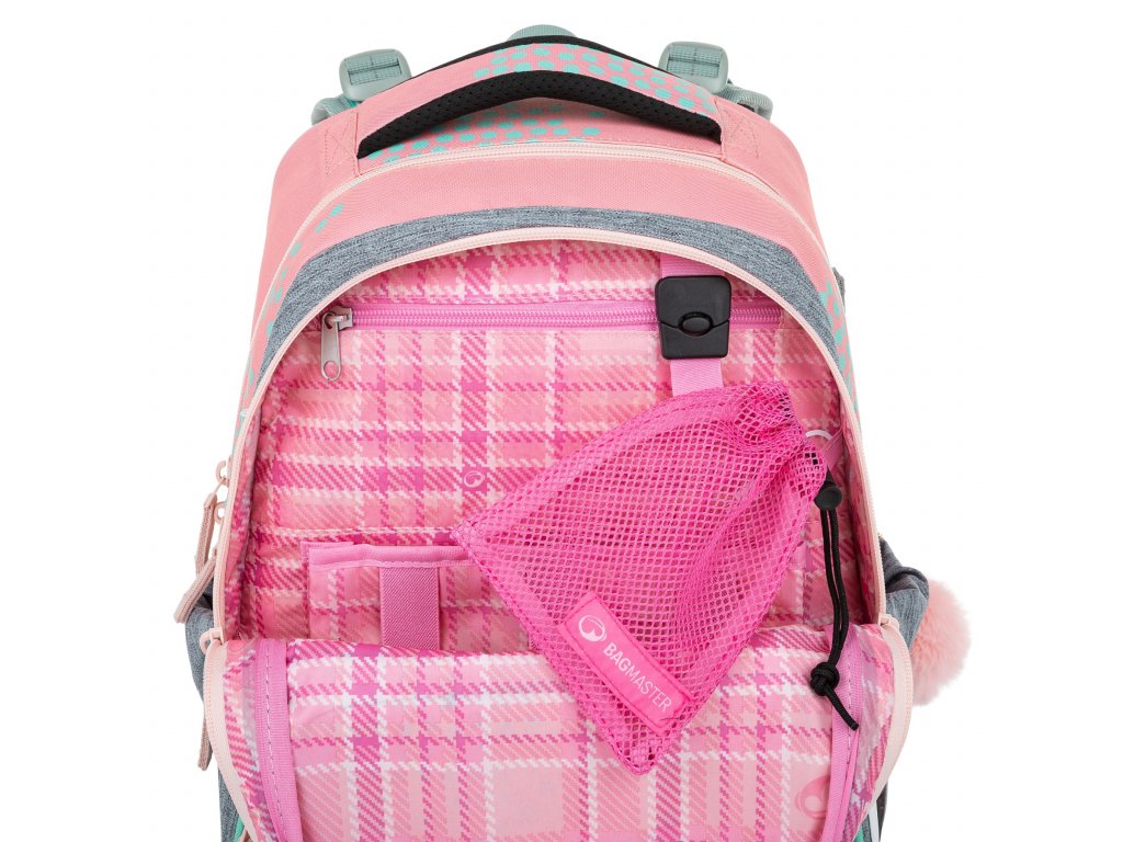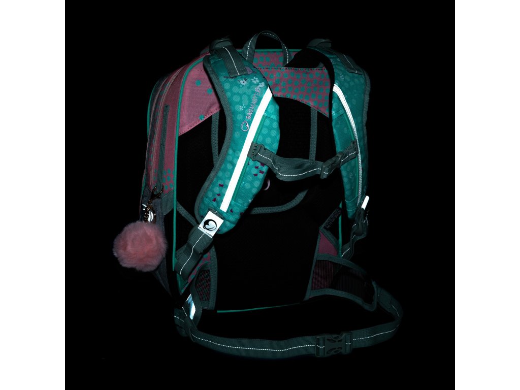 - Na černou přezku ve spodní přední komoře můžete školačce připnout síťovaný sáček. Třeba na peníze nebo sluchátka.
