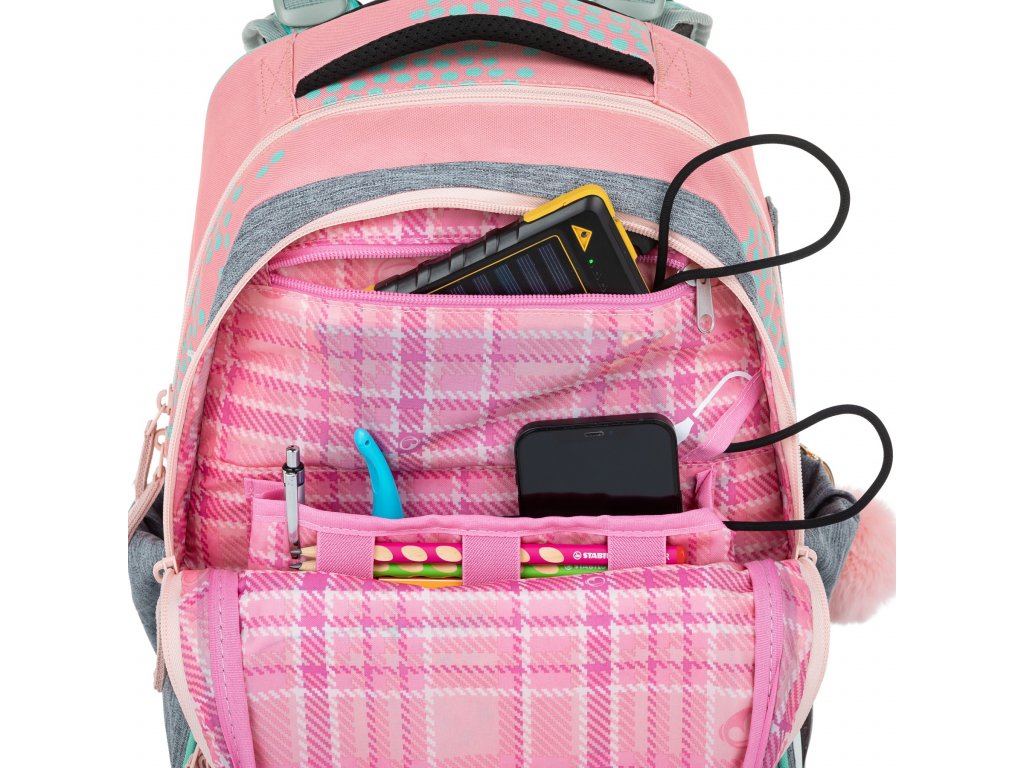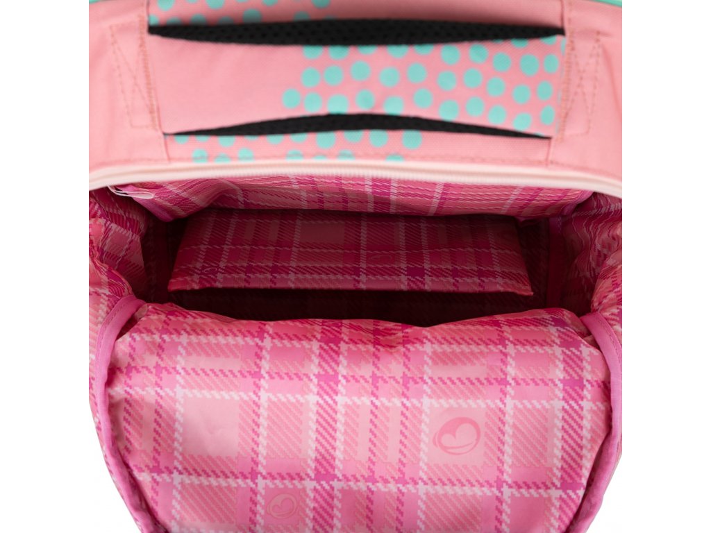 - V hlavní komoře je taky kompresní kapsa s elastickými postranními pásy na desky A4 a na velké učebnice. Pomáhá přitáhnout a udržet těžké pomůcky co nejvíce u zad, díky tomu má školák či školačka těžiště blízko páteře a při chůzi se nehrbí.