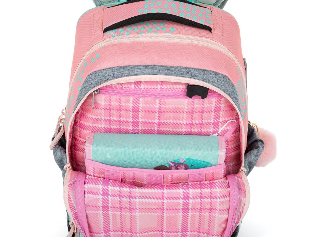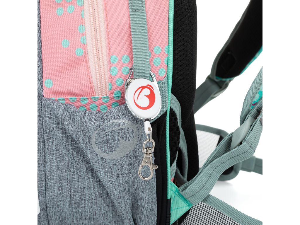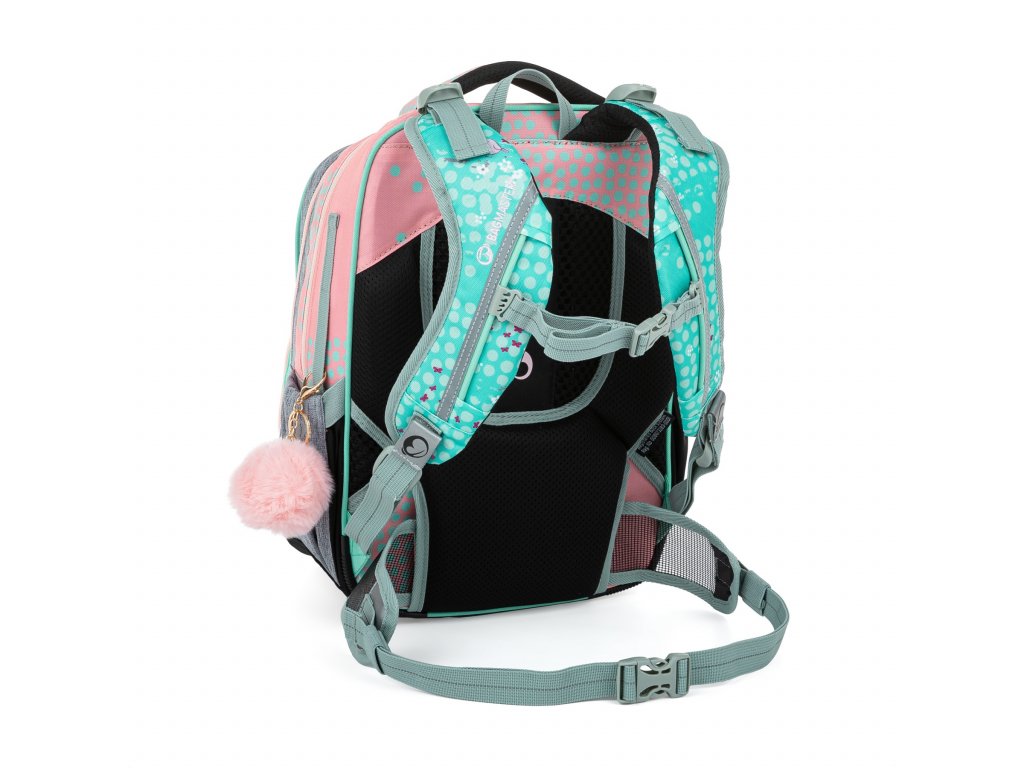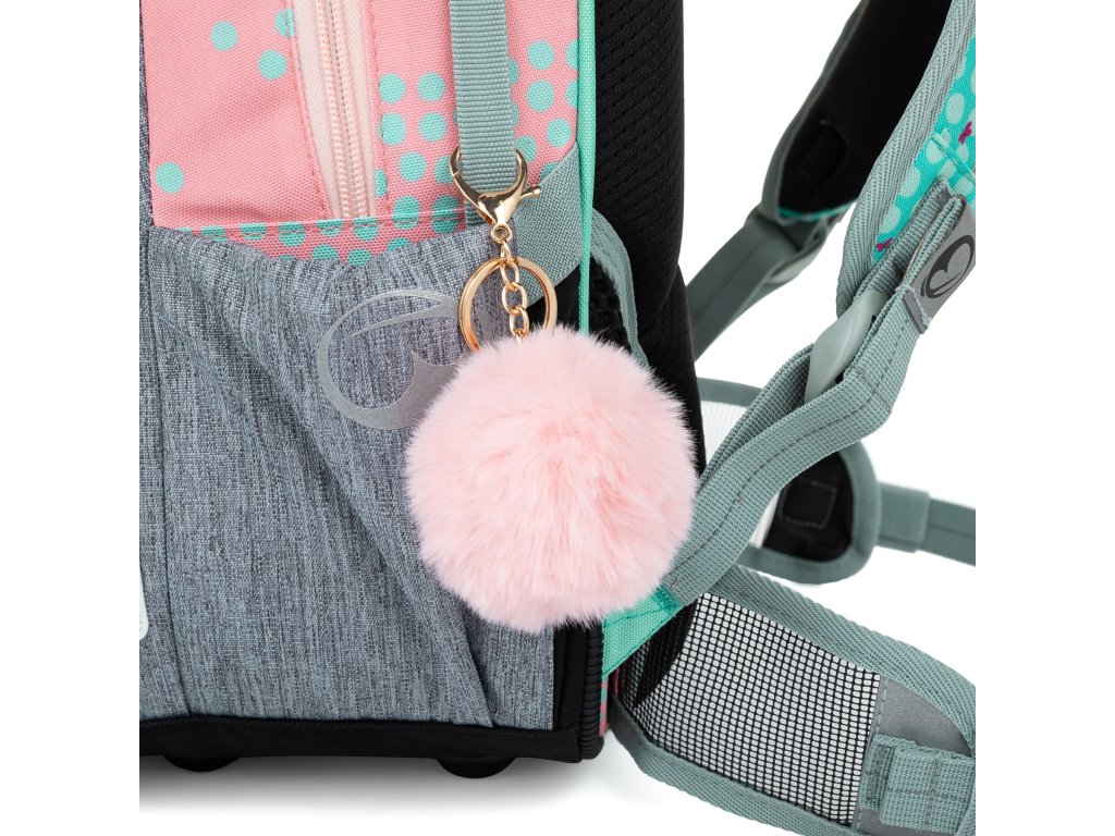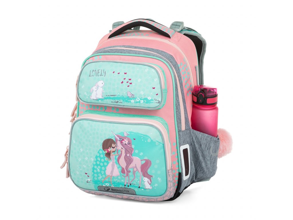 Jemný rúžovo-modro-šedý batoh s jednorožcem a králíčky pro malé slečny od 1. do 3. třídy. Je extra lehký, přitom prostorný. Má dvě velké komory a dvě praktické přední kapsičky. Stojí na plastových nožkách, ve tmě svítí reflexními prvky. Nový zádový systém s nastavitelným hrudním pásem a odlehčeným vyjímatelným bederním pásem myslí na zdravá záda dětí.