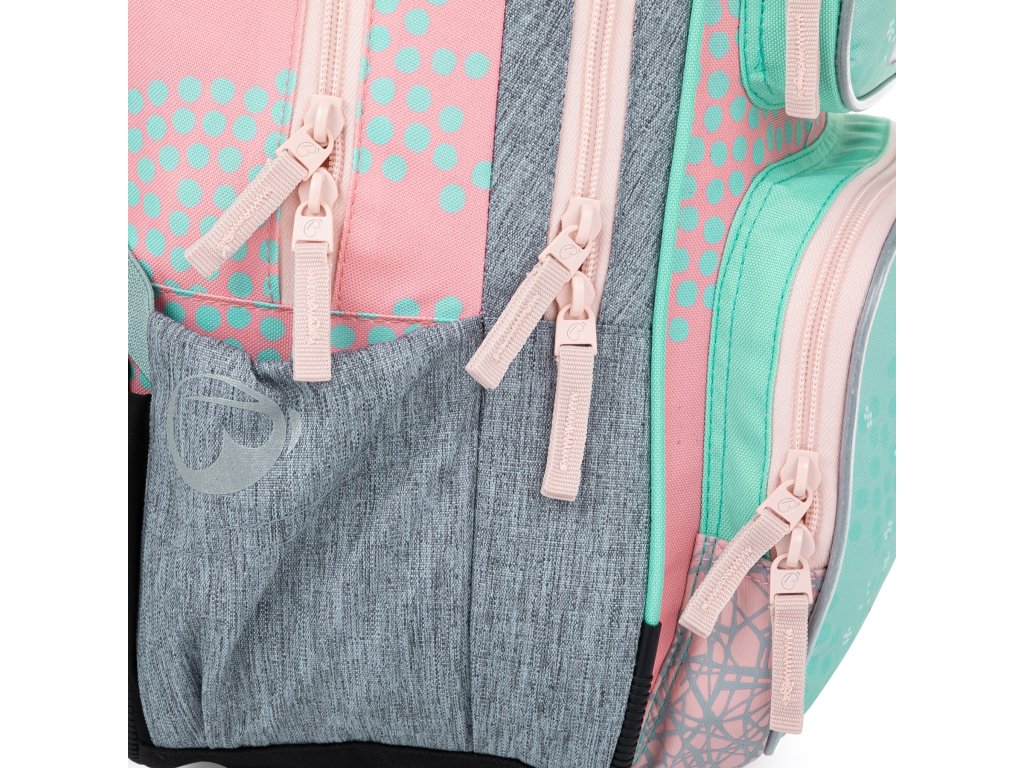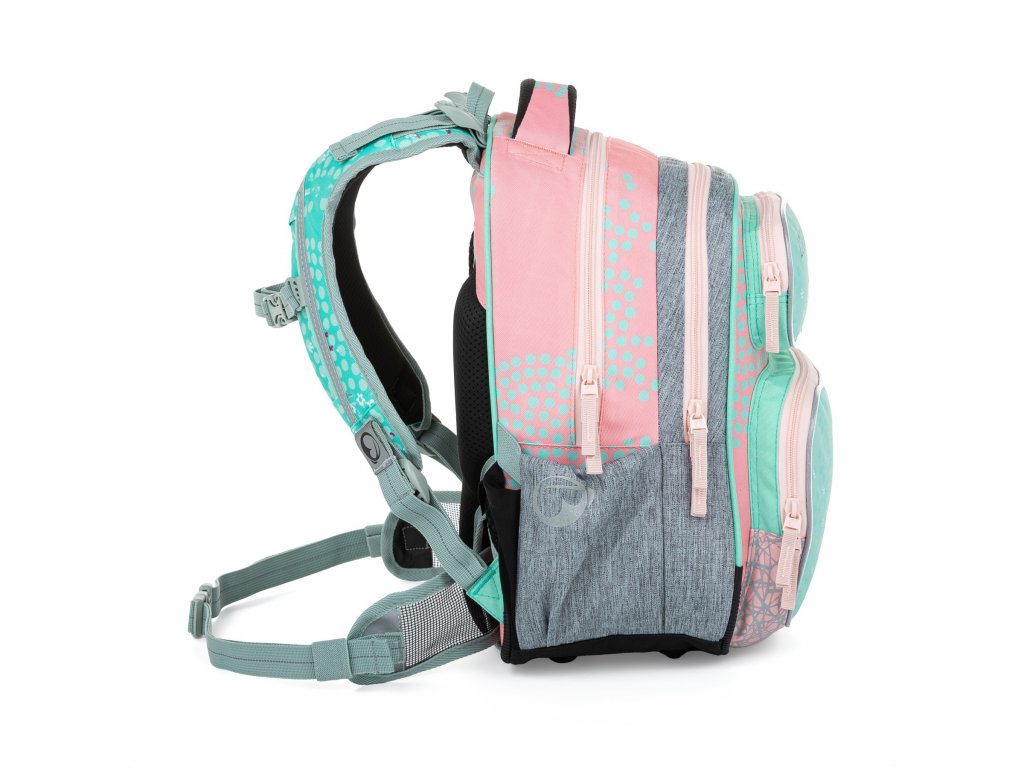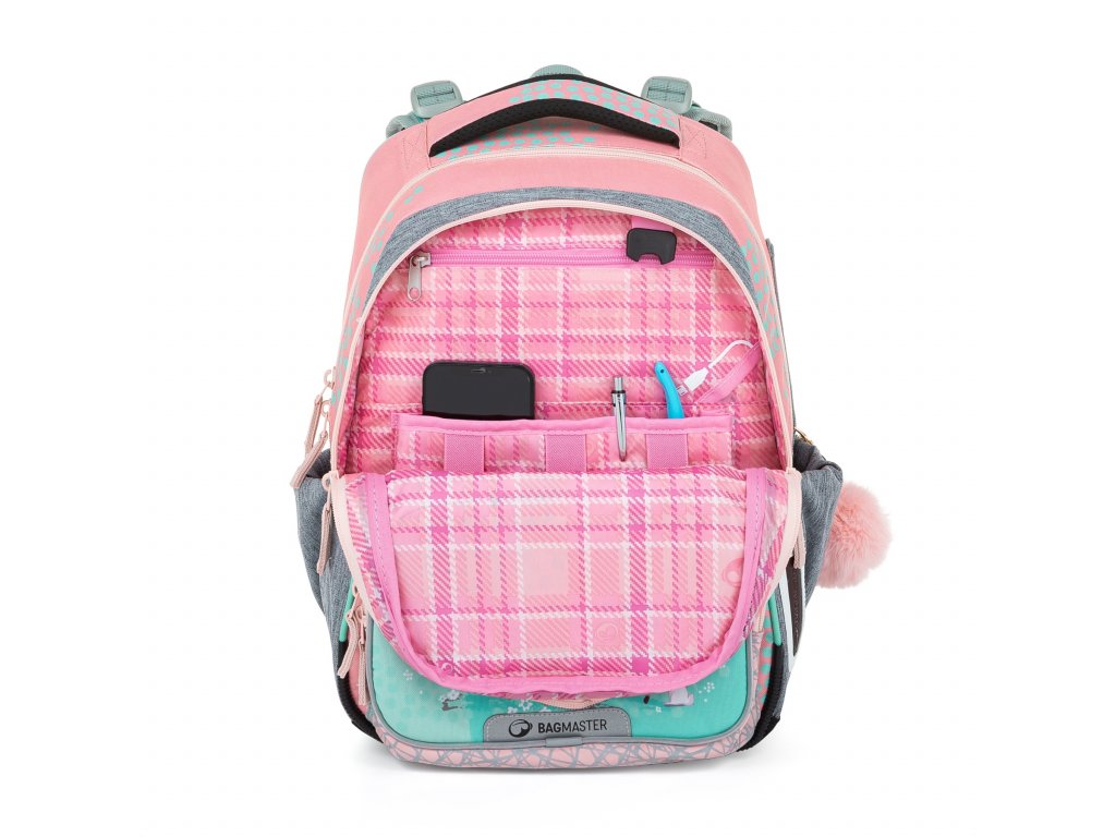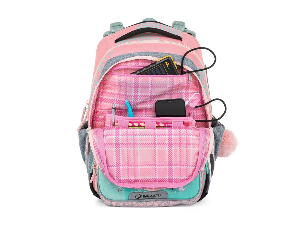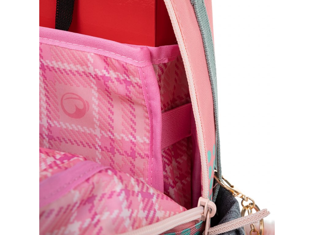 Jemný rúžovo-modro-šedý batoh s jednorožcem a králíčky pro malé slečny od 1. do 3. třídy. Je extra lehký, přitom prostorný. Má dvě velké komory a dvě praktické přední kapsičky. Stojí na plastových nožkách, ve tmě svítí reflexními prvky. Nový zádový systém s nastavitelným hrudním pásem a odlehčeným vyjímatelným bederním pásem myslí na zdravá záda dětí.